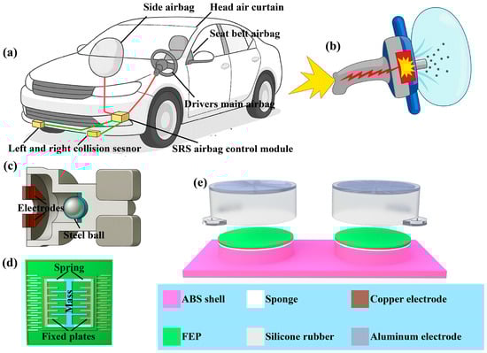 Concept and components of the intelligent system for automotive airbags. (a) The installation positions of different types of airbags. The green lines represent the circuit connection between the sensor and control module. The red lines represent the circuit connection between the control block and the airbag. (b) Schematic diagram of the gas generator. (c) Mechanical collision sensor. (d) Accelerometer sensor. (e) TENG structural design schematic diagram.