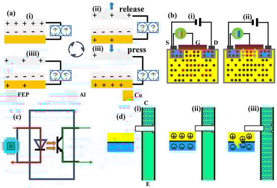 Photocouple is a component that can achieve electrical signal isolation. As displayed in Figure 2c, its input terminal is a light-emitting diode and its output terminal is a phototransistor. When there is no signal input, the light-emitting diode is turned off (Figure 2c(i)). When a signal is input, the light-emitting diode conducts, and the holes in the p-type semiconductor and the electrons inside the n-type semiconductor will gather near the pn junction, which is a process of electronic energy-level transition (Figure 2c(ii)). Electrons transition from a high energy level to a low energy level, and the energy is radiated in the form of photons. This light signal will turn on the phototransistor, and the collector–emitter electrode output terminal will output a signal (Figure 2c(iii)). It can be seen that the optocoupler achieves electrical isolation between input and output signals through the light emitted by the light-emitting diode as a medium.