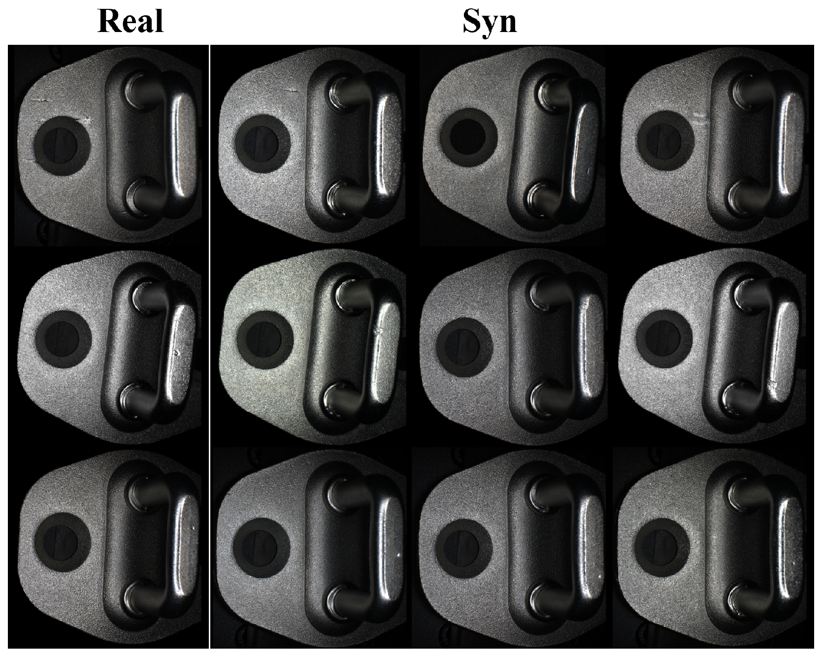 9]. On the other hand, generating synthetic data from precise CAD models to overcome sample scarcity is challenged by the non-trivial domain gap between rendered images and real-world captures, as well as inherent geometric and appearance variations in manufactured parts that perfect CAD models do not capture [