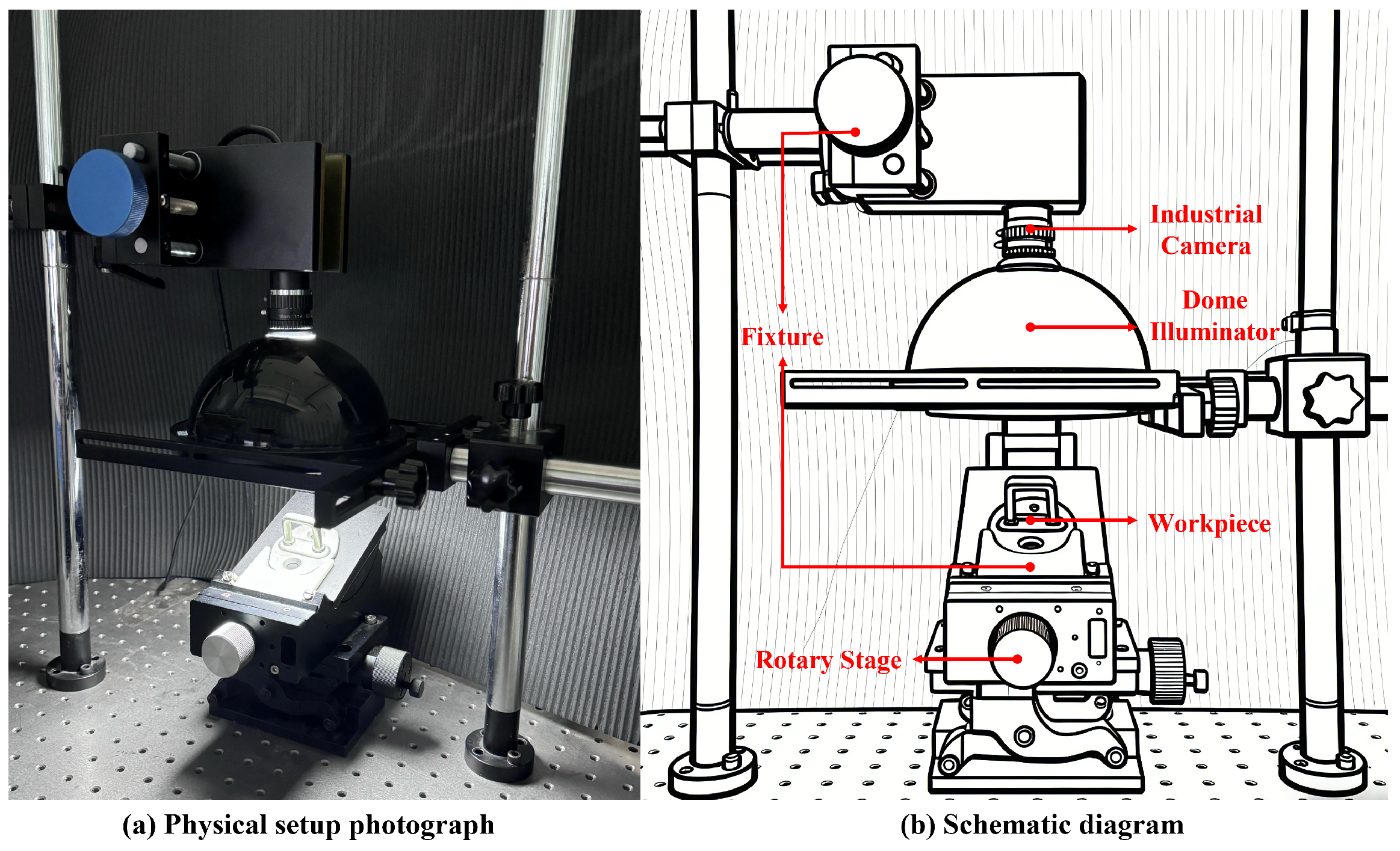 (2) Robust Imaging Subsystem for Highly Reflective Complex Workpieces: A dedicated imaging device integrating precision fixtures, dome diffuse lighting, and a small-aperture lens was developed. This subsystem effectively suppresses specular highlights and irregular shadows, providing high-quality images with uniform illumination and salient features for subsequent processing stages, reducing imaging interference at the source.