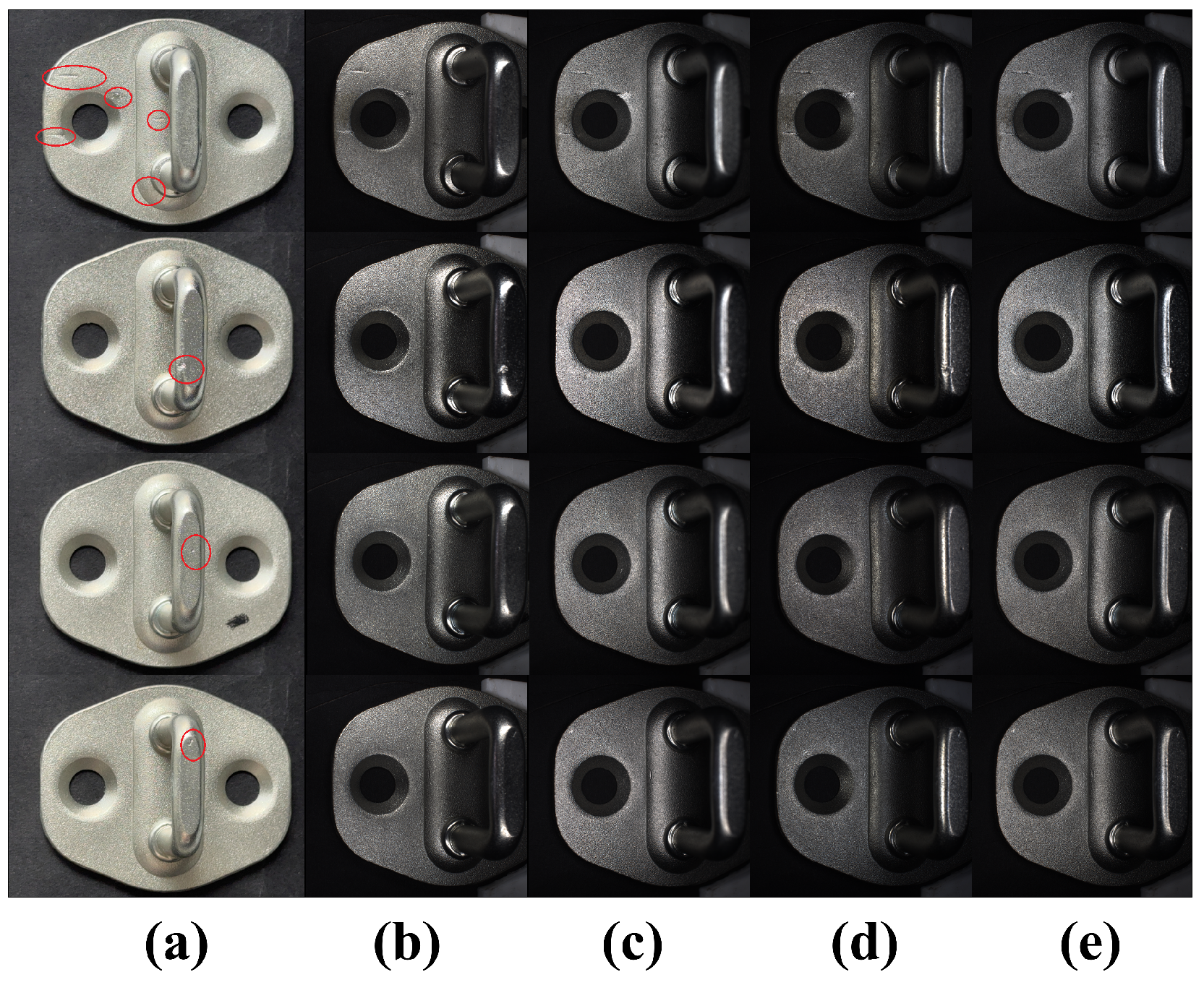 Future research work will focus on the following aspects: Firstly, we will further optimize the structure of the feature extraction and generation modules to enhance the model’s ability to adapt to and reconstruct diverse defect features, thereby improving the generation quality for complex defects. Secondly, we are investigating a robotic arm-assisted “pose unification strategy,” where a robotic grasping and positioning system stably places the workpiece in the same location and orientation, effectively reducing imaging interference caused by pose variations and improving data consistency and generation stability. Furthermore, we will also dedicate efforts to optimizing the multi-light source configuration and illumination parameters in the optical imaging system to further enhance the ability to extract faint defects and improve feature visibility. We plan to extend this method to more types of non-planar metal workpieces, such as door hinges, support arms, and connectors, which have complex 3D structures, and conduct extensive validation under diverse fixturing and lighting conditions to further test the system’s generalization ability and robustness. We will also explore controllable defect parameter generation technology, enabling it to adapt to different manufacturing standards and quality assessment needs, further expanding its application potential in industrial visual inspection.