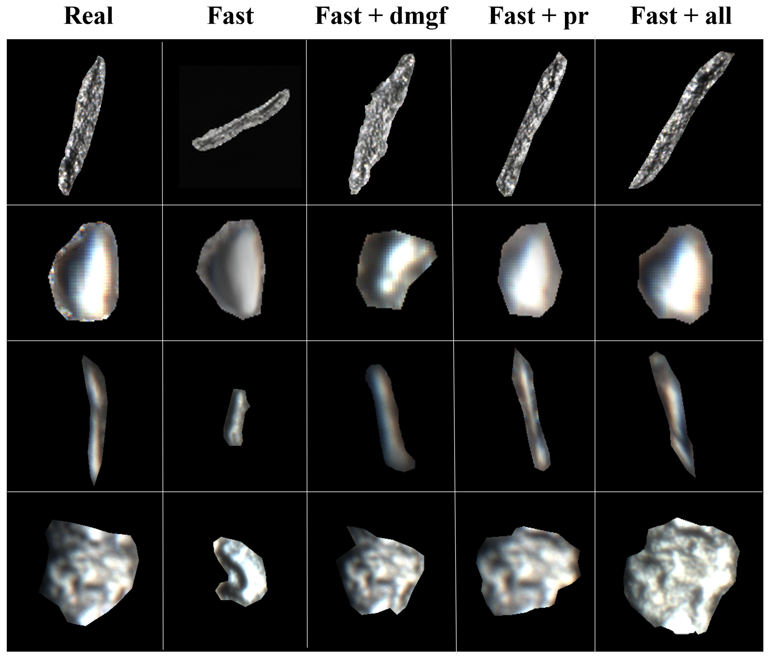 Figure 9. The first column displays real defect patches as reference images, while the other columns present defect patches generated by different methods, with each row corresponding to a specific defect type. When using FastGAN alone, the generated defect patches exhibit darker tones, simpler shapes and blurred edges, deviating significantly from real defect appearances. When DMGF-SLE is added alone, cross-layer feature interactions enhance the structure and texture details, resulting in sharper edges, though some unnatural jagged edges appear, particularly in the first and fourth rows of the third column. When only the perceptual loss module is used, it refines details by eliminating jagged edges and improving texture and structure, but the shapes tend to become more conservative. When both DMGF-SLE and perceptual loss are combined (FastGAN+All), the generated defect patches show significant improvements in detail capture, structural consistency, and natural transitions, closely resembling real defect patches in terms of texture, edge clarity, and overall visual quality.