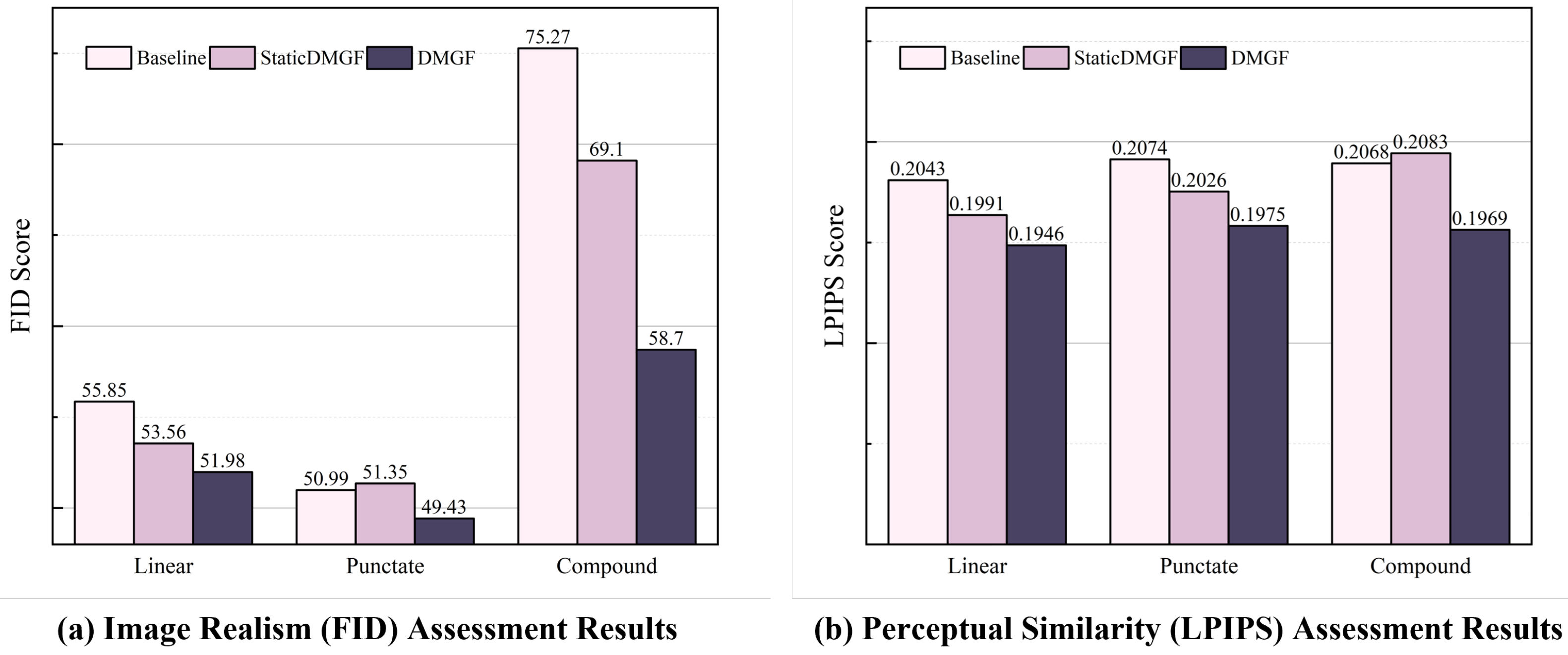 Table 9). Compared to DFMGAN, our two-stage generation strategy reduced the FID score by 18.3% (31.51 vs. 38.59), while also significantly improving training efficiency. As shown in