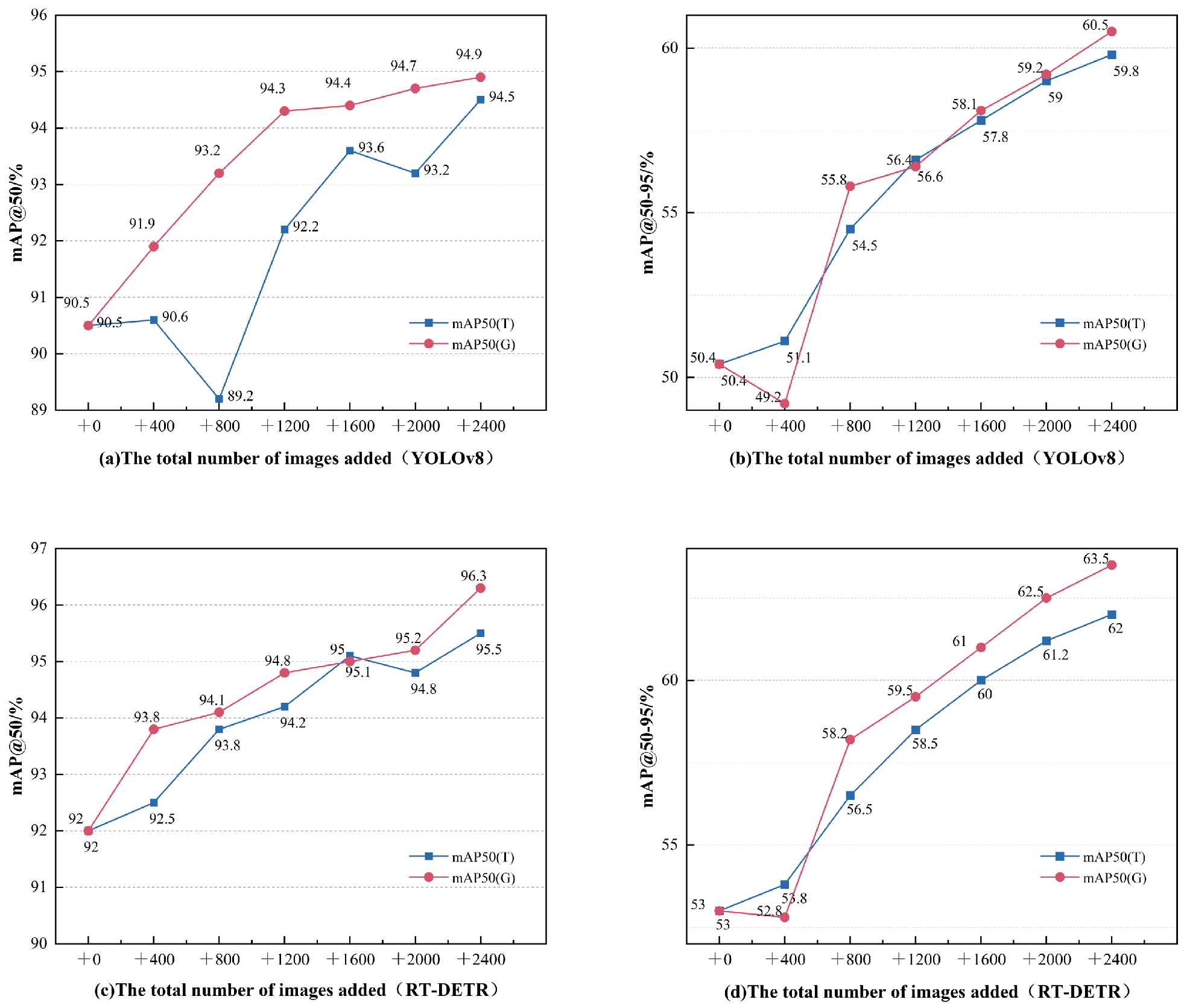Figure 14a,b indicate that both our generated sample method and the traditional augmentation method effectively improve model performance. When the sample size increased to 2400, the generative method outperformed the traditional method in both mAP@50:95 (60.5% vs. 59.8%) and mAP@50 (94.9% vs. 94.5%), demonstrating its performance advantage. Although the performance of both methods showed an overall upward trend with increasing sample size, the traditional method exhibited significant instability, with a notable performance drop at 800 samples (mAP@50 = 89.2%), likely due to distribution bias introduced by geometric transformations. In contrast, the generative method exhibited only slight fluctuations at small sample sizes (400) due to initial distribution bias, followed by stable improvement, indicating that the feature distribution of its generated samples is closer to the real data, providing a more robust augmentation effect. It is noteworthy that the generative method consistently achieved higher gains in mAP@50:95, reflecting its particular effectiveness in improving localization accuracy. When the sample size was large (2000–2400), the incremental improvements gradually diminished, suggesting that the performance might be approaching its upper limit under the current constraints. Overall, while maintaining stability, the generated samples demonstrated superior potential for performance improvement compared to traditional methods. To eliminate the dependency of our conclusions on a single model architecture, we conducted comparative experiments on the RT-DETR model, with results shown in