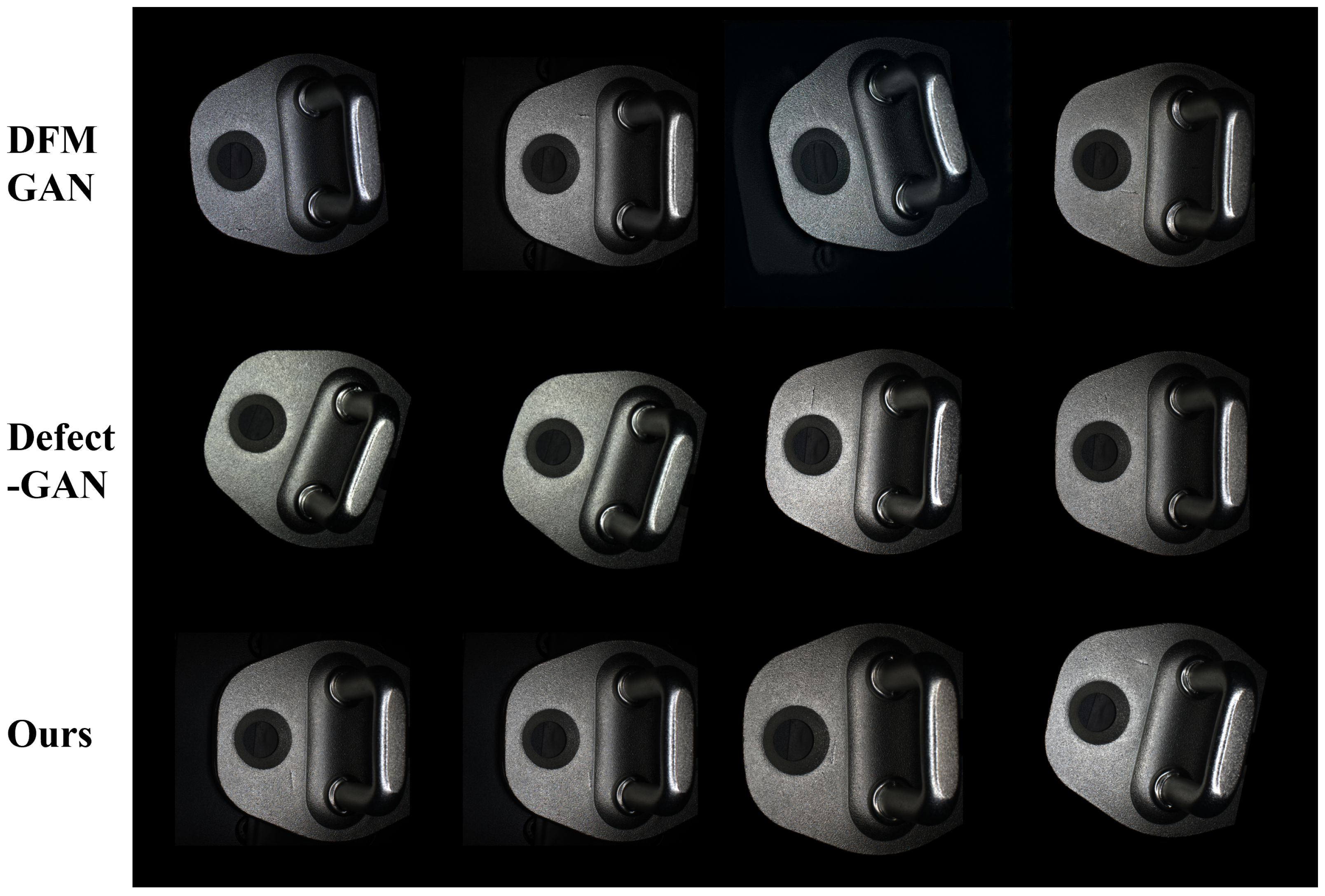 Figure 15, although the defect details generated by DFMGAN exhibit high realism, insufficient training in its first-stage background generation leads to two key issues: (1) distortion of background shape and texture, and (2) unnatural color shifts (an anomalous bluish tint). The single-stage architecture of Defect-GAN has fundamental limitations in modeling complex geometries, resulting in poor training efficiency metrics (FID = 59.18, training time 10 h).