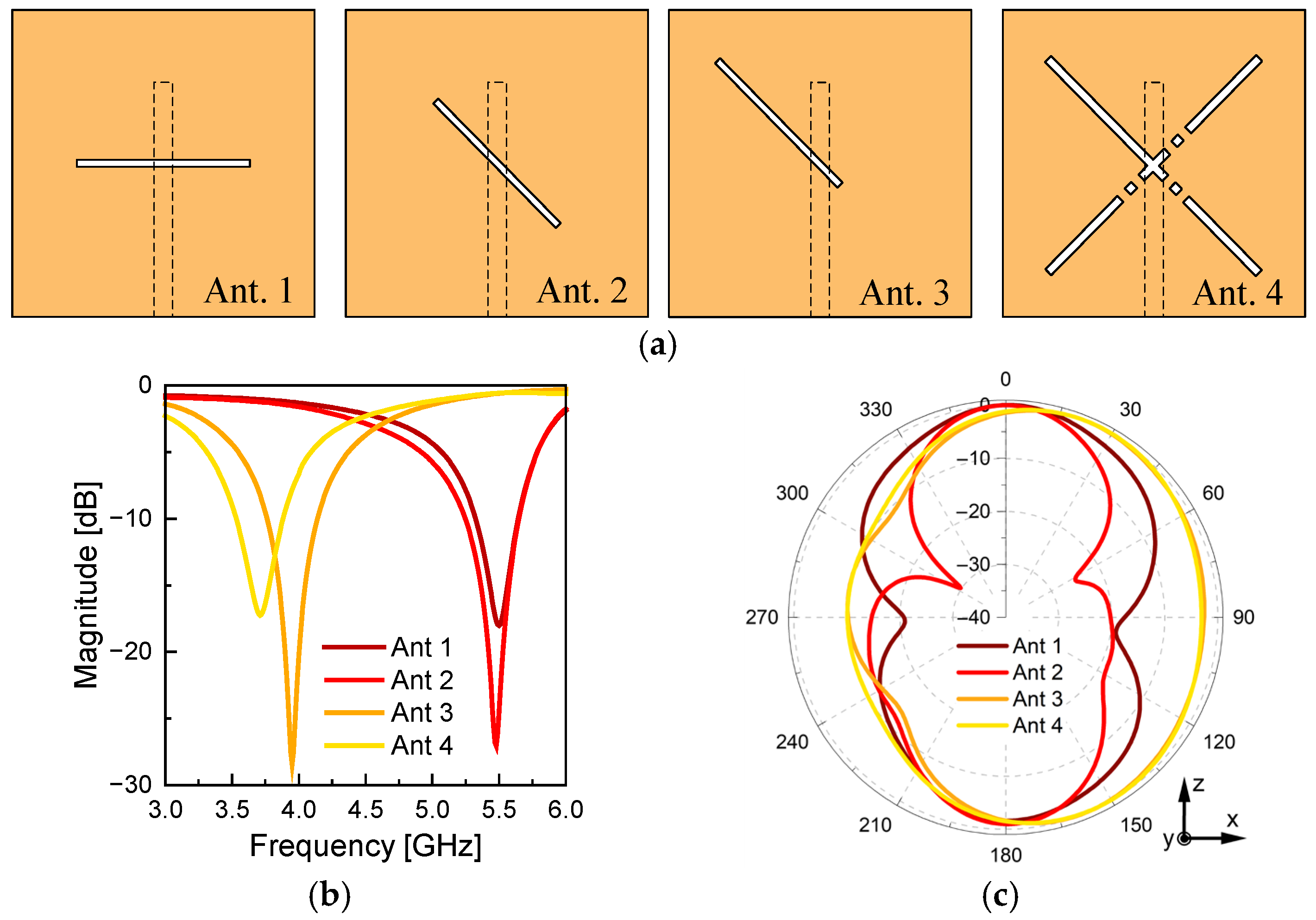 As previously described, most existing designs are based on slot antennas that offer a wide beam-switching range. However, these studies mainly emphasize radiation pattern steering, while frequency reconfigurability for adapting to dynamically changing spectral environments has attracted relatively little attention [
