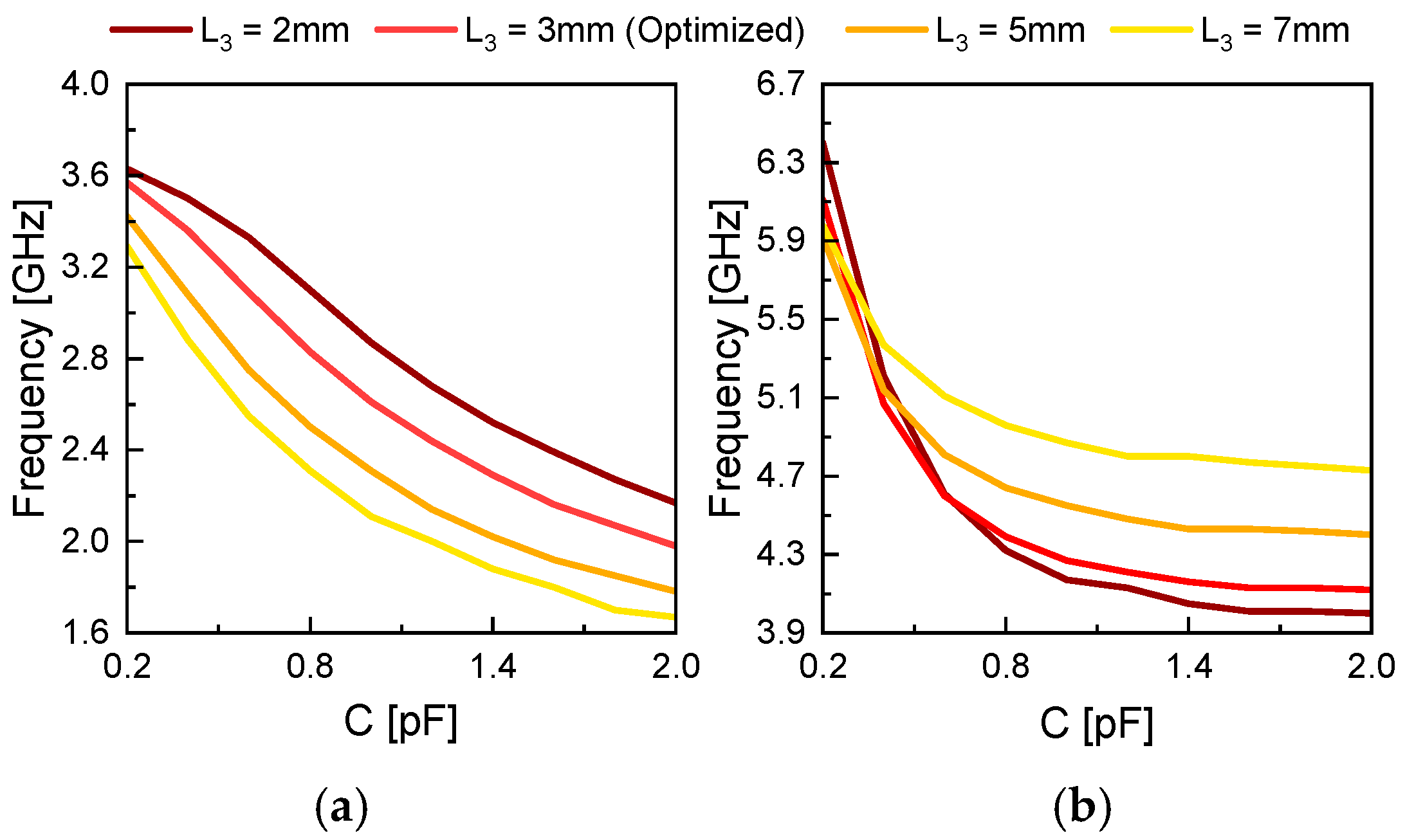 When L3 ≤ 3 mm, the shift in fH becomes negligible, which may affect the frequency tunability of the proposed structure. Therefore, L3 = 3 mm is finally selected as the optimal position that ensures minimal impact on frequency tuning performance while maintaining a sufficiently small spacing between the two resonant frequencies.