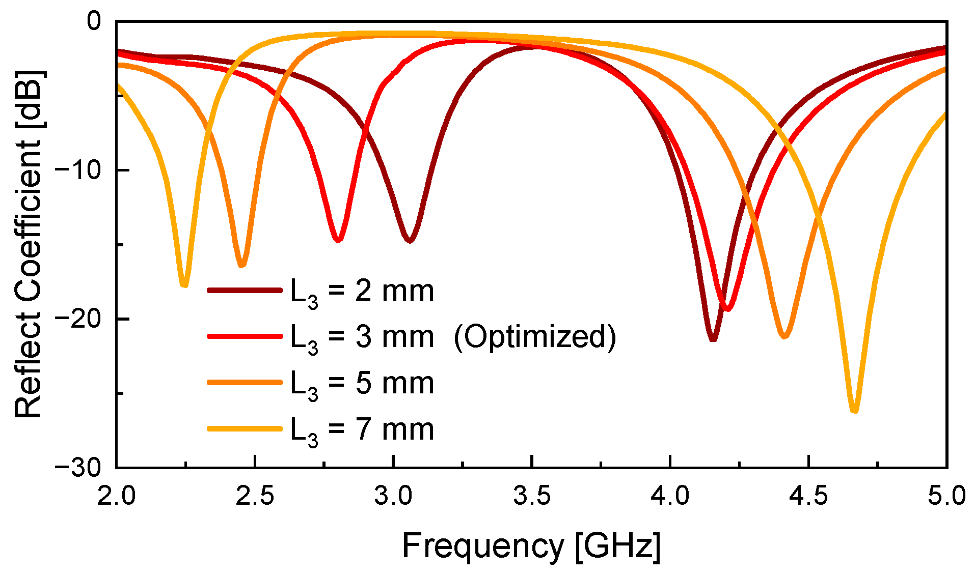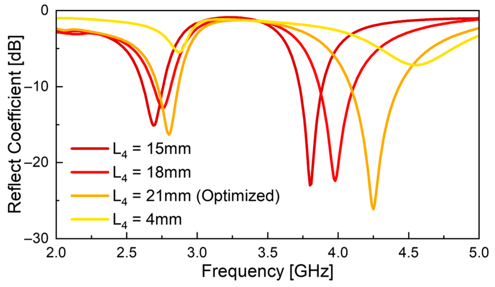 L4—i.e., as the diode moves closer to the center of the slot, the effective length of the active slot increases, resulting in a downward shift in the overall resonant frequency. However, this trend does not affect both resonant frequencies equally. In the low-frequency band, the frequency shift is relatively small, whereas in the high-frequency band, the change in