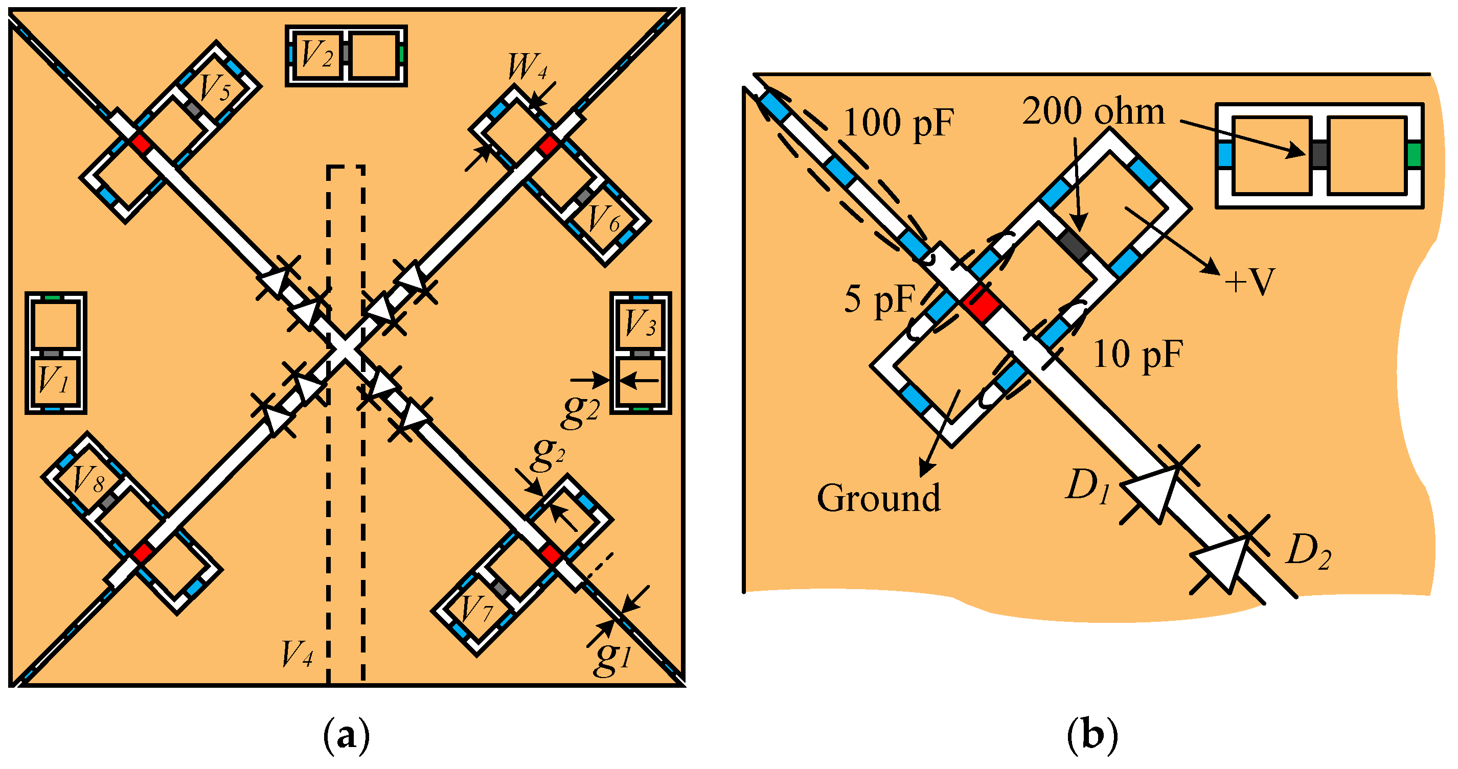 Figure 10b, the rightmost pad receives a positive voltage, and the leftmost pad is connected to ground. Each pad is configured independently through separate capacitors, ensuring electrical isolation from the operation of the PIN diodes. This minimizes interference between the frequency tuning function and the beam-switching function.