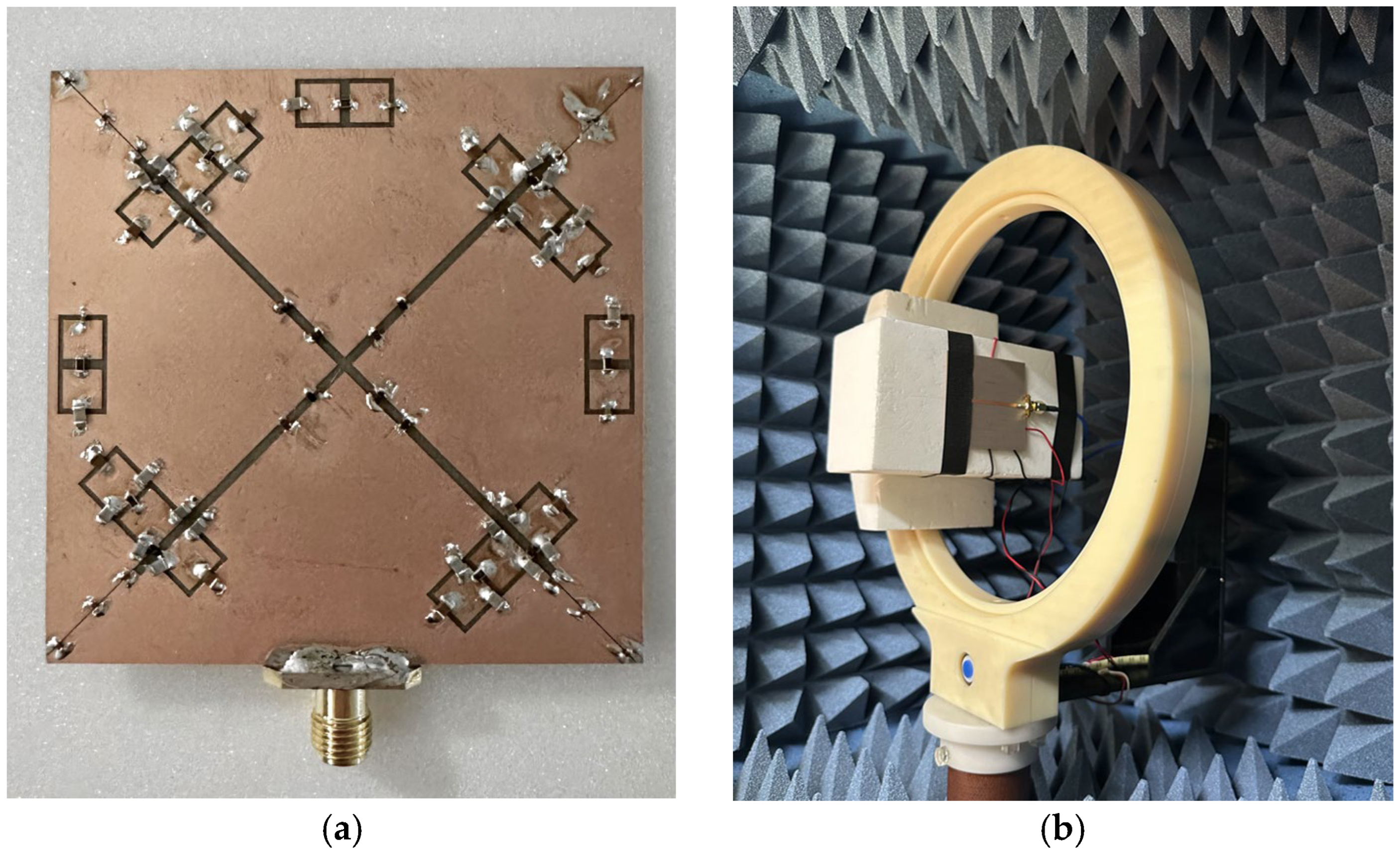 Figure 11a shows the fabricated prototype of the antenna, while