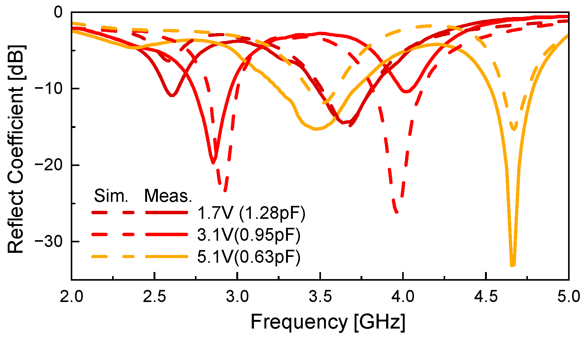 Figure 10. Both simulation and measurement are conducted in Mode 1. The varactor diode is biased with voltages of 1.7 V, 3.1 V, and 5.1 V, corresponding to equivalent capacitances of 1.28 pF, 0.95 pF, and 0.63 pF, respectively. As the applied bias voltage increases, the lower resonant frequency