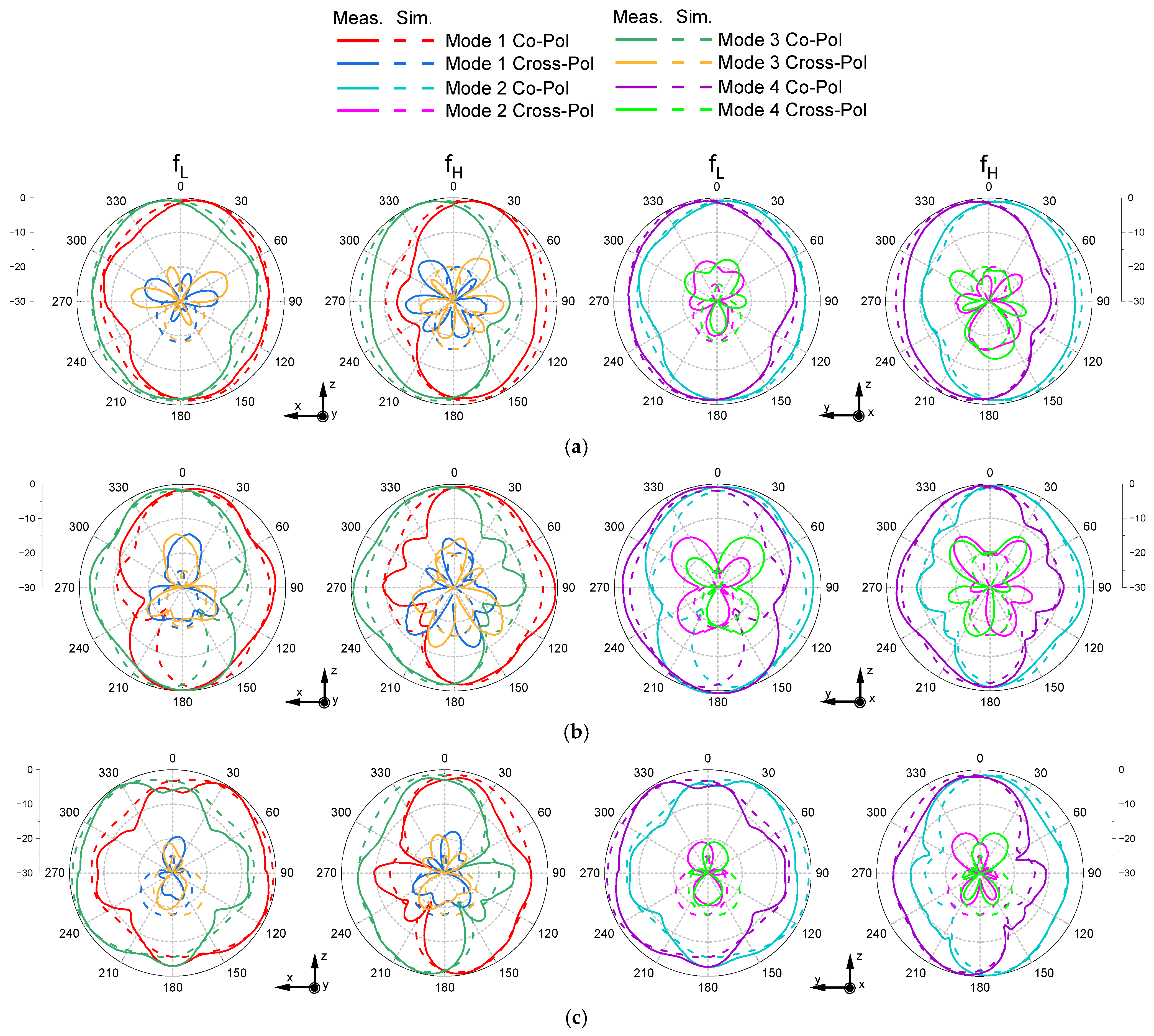 Figure 13 shows the simulated and measured radiation patterns for all four operating modes under the same bias conditions as in