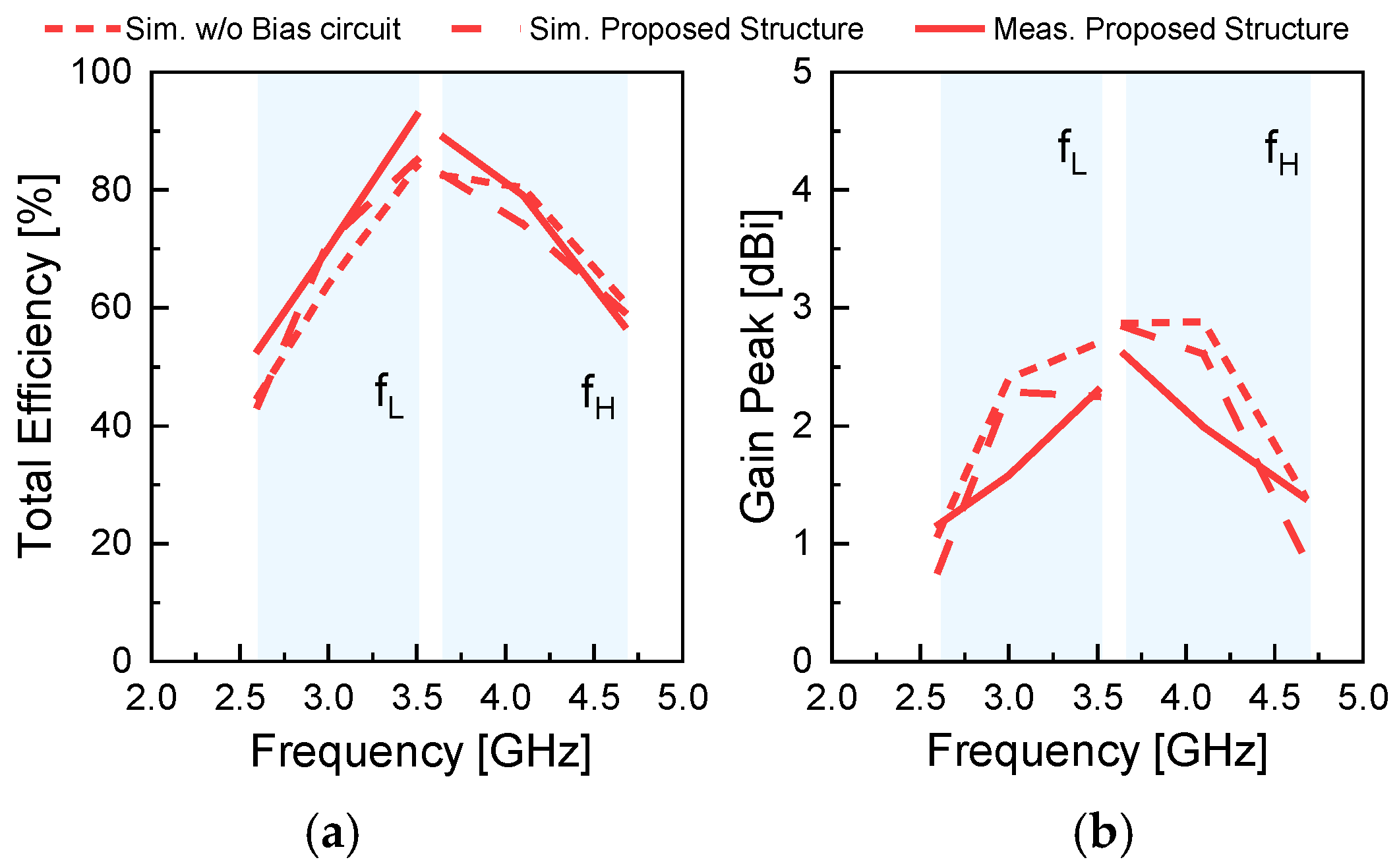 Figure 15a, the total efficiency is not significantly affected by the bias circuit. The simulated total efficiencies with and without the bias network remain close over most of the operating frequency range. The measured total efficiency, obtained with the bias circuit implemented, ranges from 52.8% to 92.7% and follows the simulated trend across the operating band.