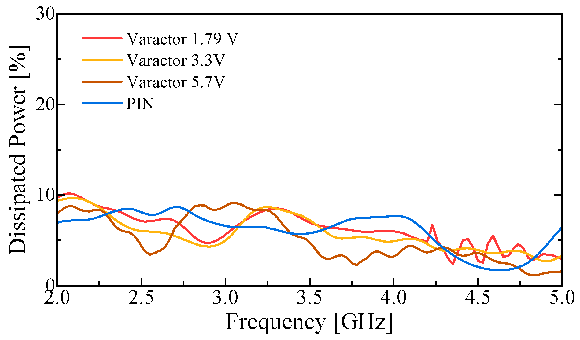 To assess the contribution of the reconfiguration elements to the observed efficiency reduction, the RF losses of the PIN diode and the varactor diode were characterized independently, as shown in