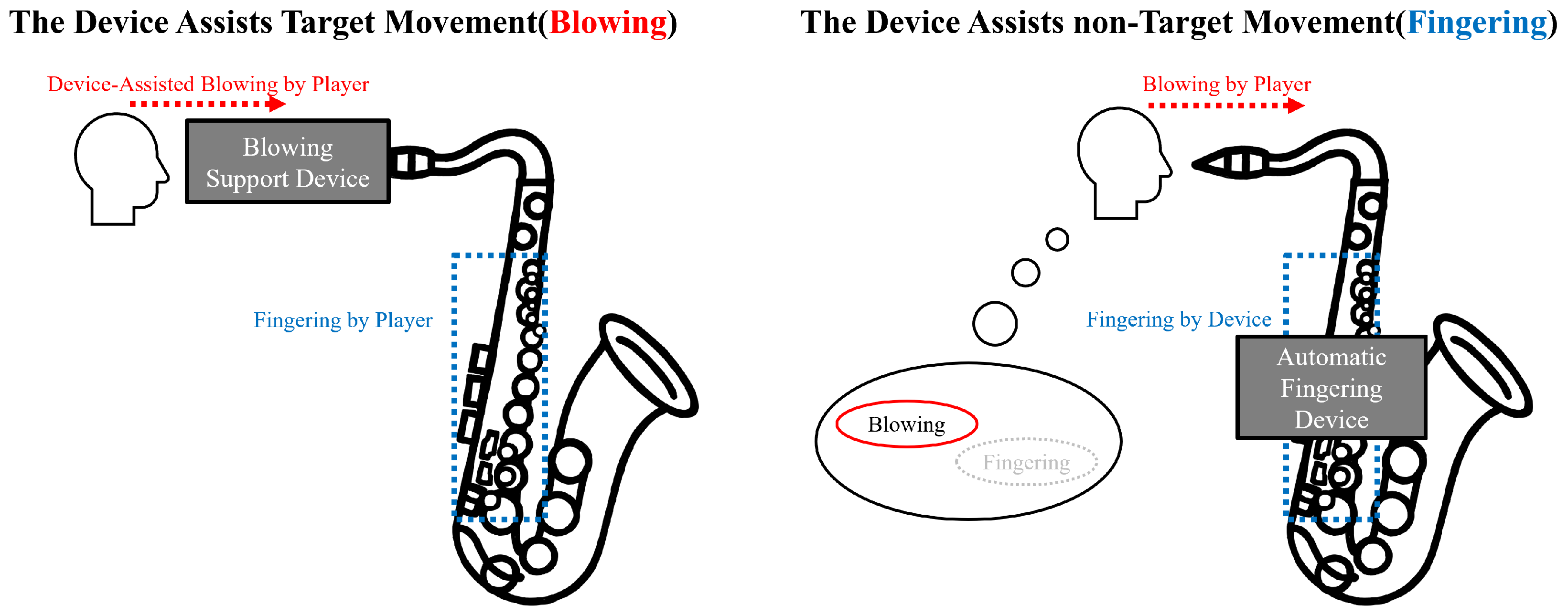 Figure 1 illustrates this classification using examples related to supporting saxophone-blowing actions.