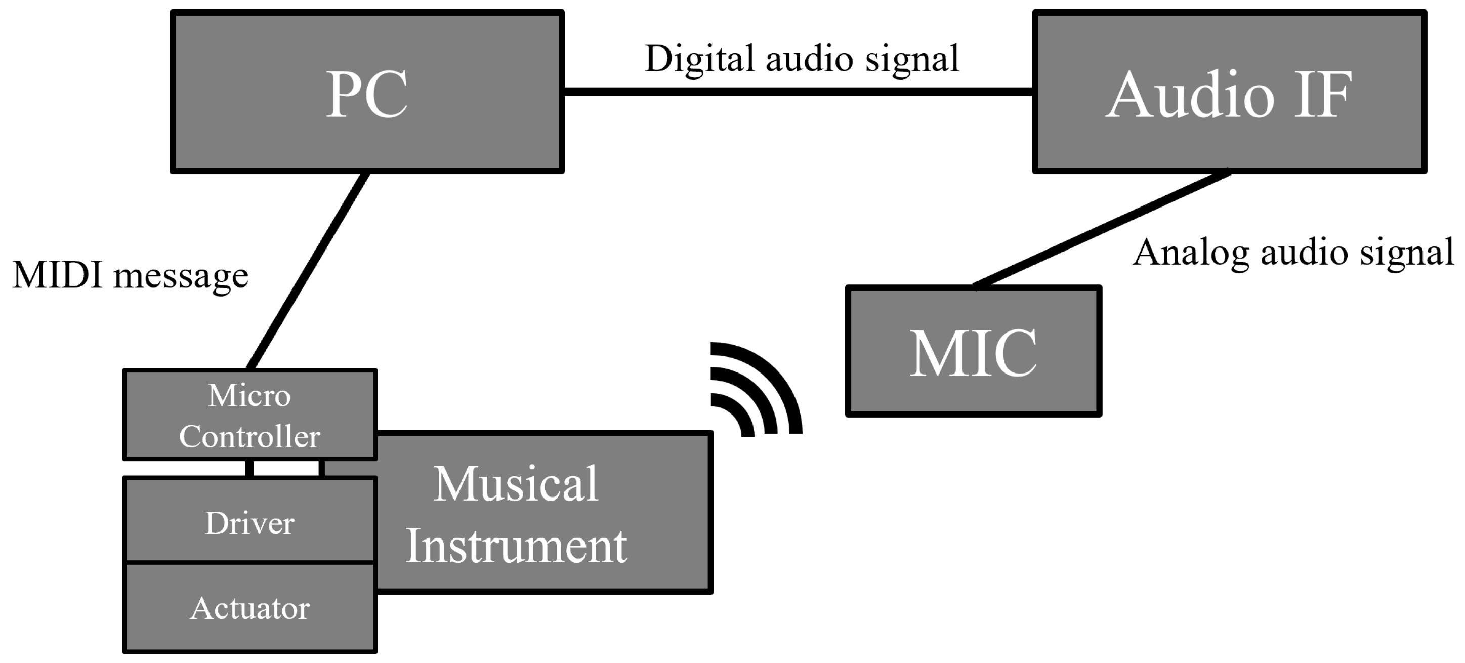 Supplementary Materials. The system comprises a PC, a musical-instrument robot attached to the instrument, an audio interface (Audio IF), and a microphone. In the system, the PC controls the playing actions of the musical-instrument robot, while the microphone signal is converted into digital audio by the Audio IF and subsequently delivered to the PC via ASIO, a low-latency audio-transfer driver. Therefore, an ASIO driver must be installed on the PC in advance; in this study, we employ the Yamaha Steinberg USB Driver.