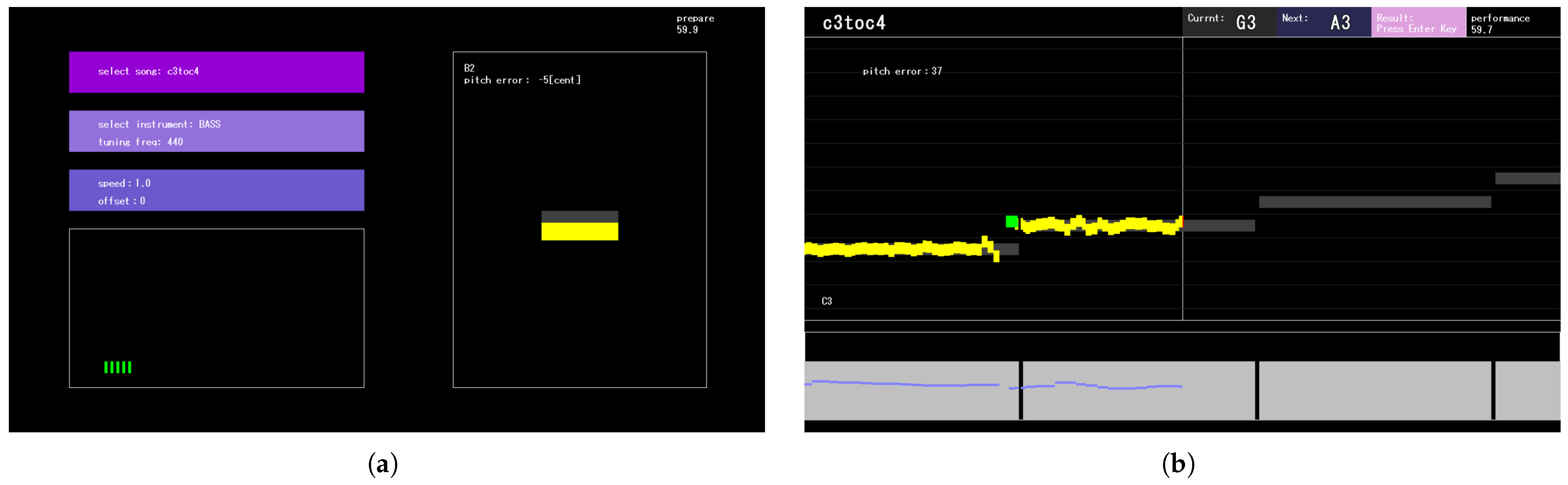 7]. Focusing on long tones—an element strongly correlated with performers’ technical level—they evaluated sustained tones and tones involving crescendo or decrescendo. The evaluation is based on frame-wise acoustic features (pitch and intensity) extracted from the performance sound. Their feedback GUI presents temporal trajectories of these acoustic features.