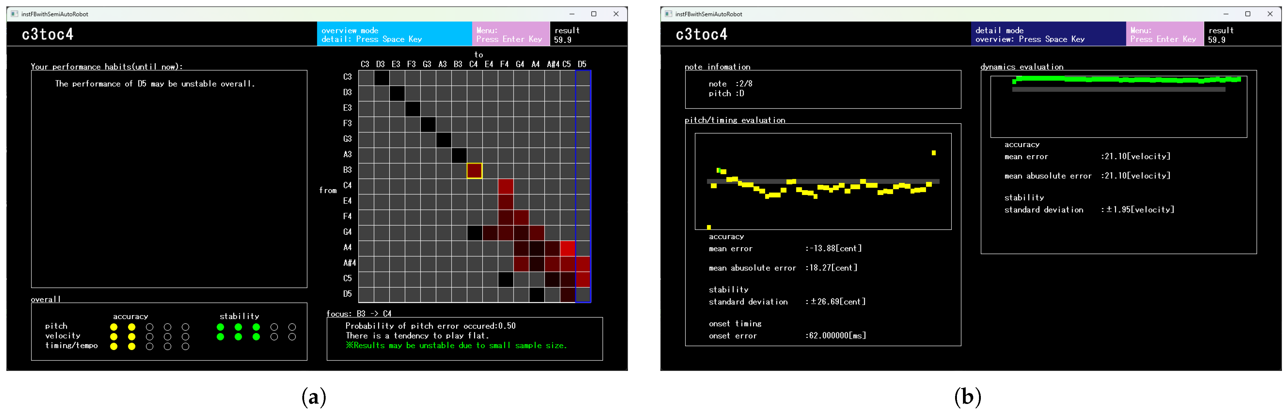 4]. Furthermore, to address the previously noted difficulty faced by beginners in accurately evaluating their own playing during individual practice, the proposed system incorporates a function that stores learners’ performance data, extracts characteristic patterns of performance errors, and feeds them back as the “performer’s habits”.