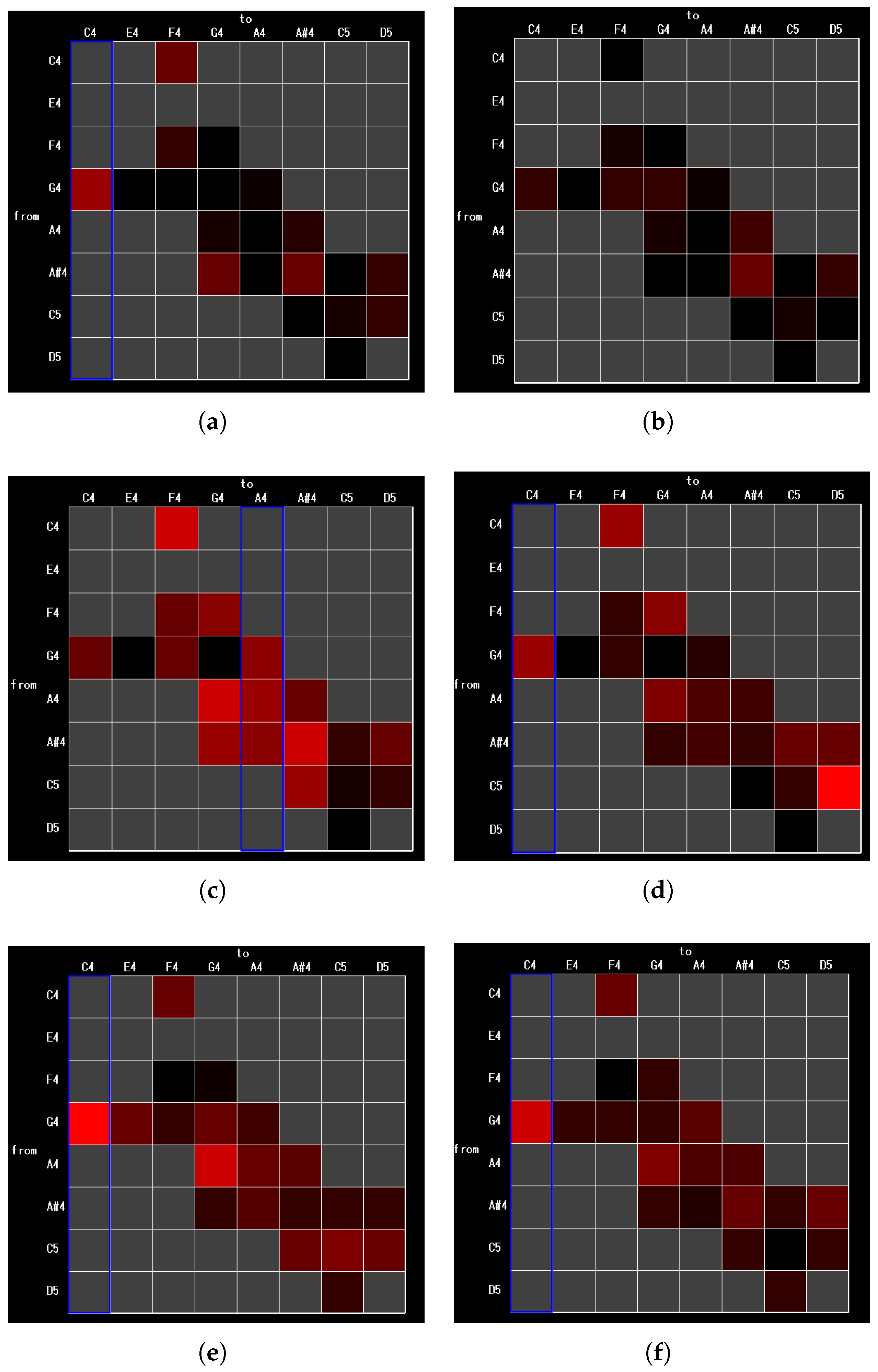 Figure 10 shows representative transition matrix heatmaps obtained from three participants. Compared with the condition without the proposed system, the heatmaps obtained with the proposed system exhibit a general tendency toward reduced error occurrences across pitch transitions. As shown in