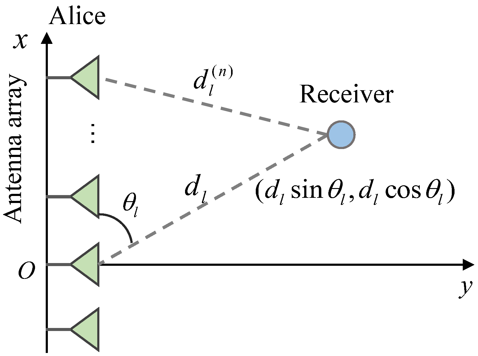 l-th receiver relative to the center of Alice’s ULA, the coordinates of the