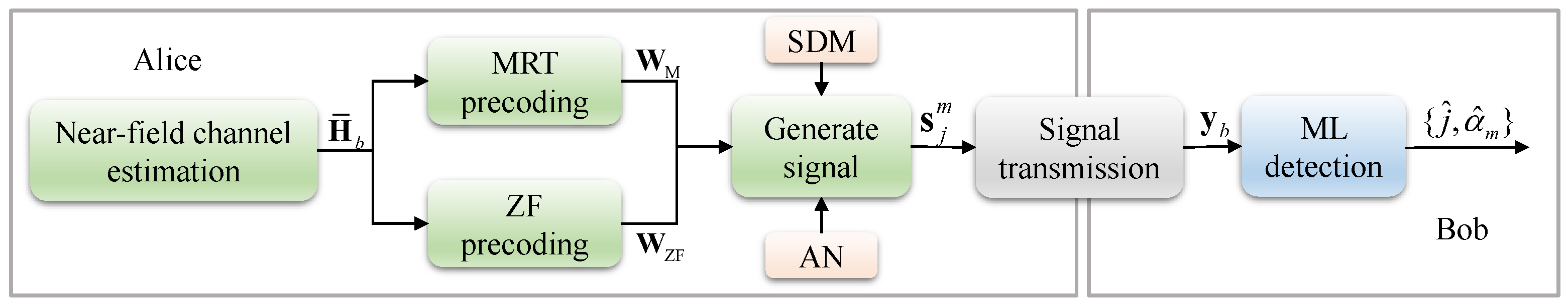Figure 3. Both Bob’s and Eve’s receivers are positioned within Alice’s near-field. Initially, Alice performs near-field channel estimation on the Alice–Bob link. Utilizing the estimation results, Alice generates the corresponding precoding matrix. Simultaneously, the transmitted signal is constructed, incorporating the antenna indices, APM symbols, and AN, before being transmitted. Upon reception, Bob employs joint ML detection to estimate the antenna index and demodulate the APM symbol, thereby recovering the transmitted information. Throughout this process, the selection of antenna indices and the incorporation of AN significantly disrupt Eve’s ability to accurately intercept the transmission, thereby reducing its eavesdropping efficacy and ensuring the overall security of the system. Even if Eve applies advanced signal processing, near-field channel mismatch prevents perfect null-space alignment, leading to unavoidable AN leakage in Eve’s received signal.