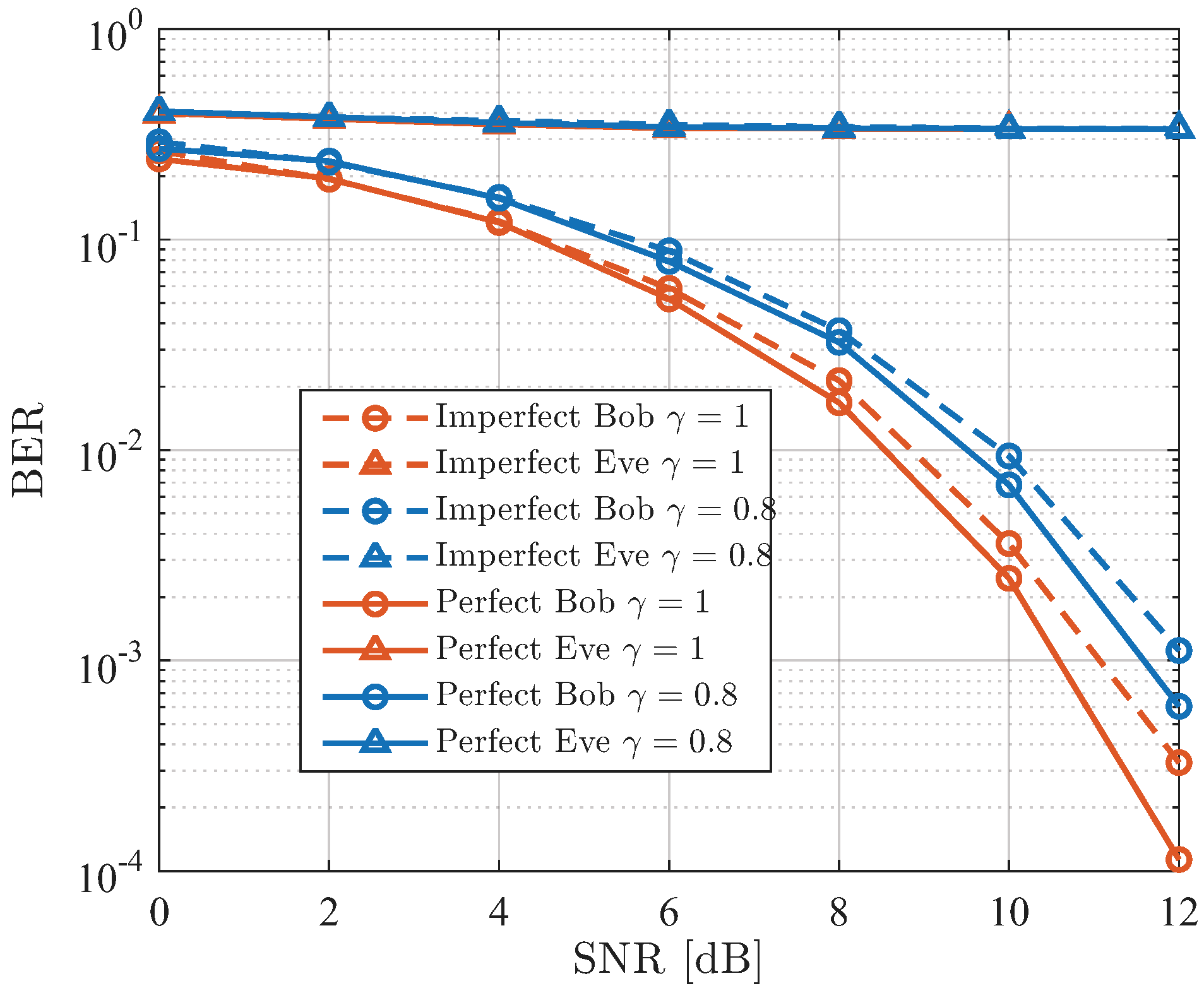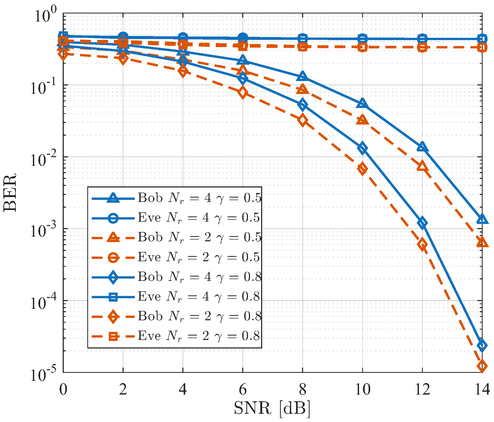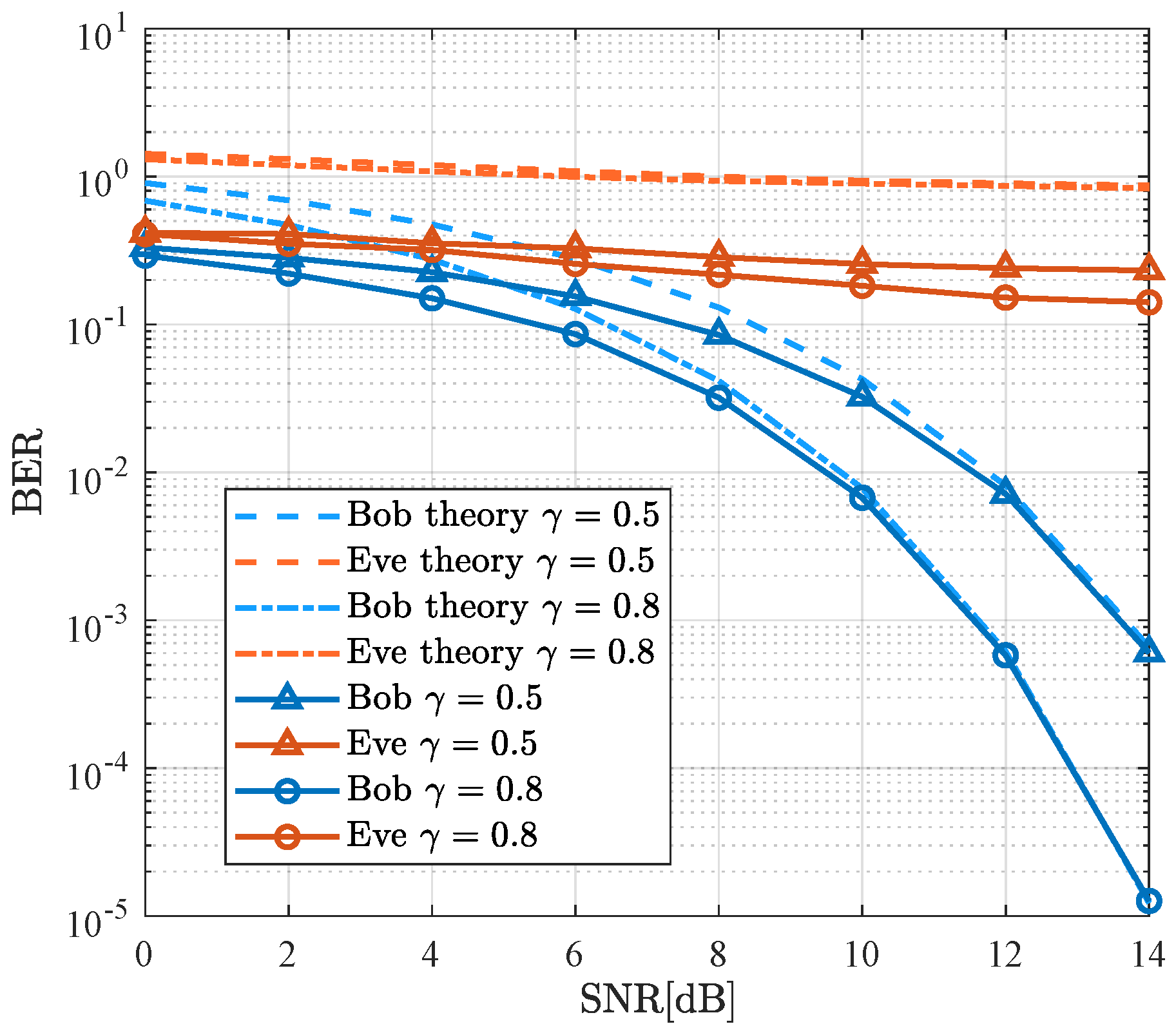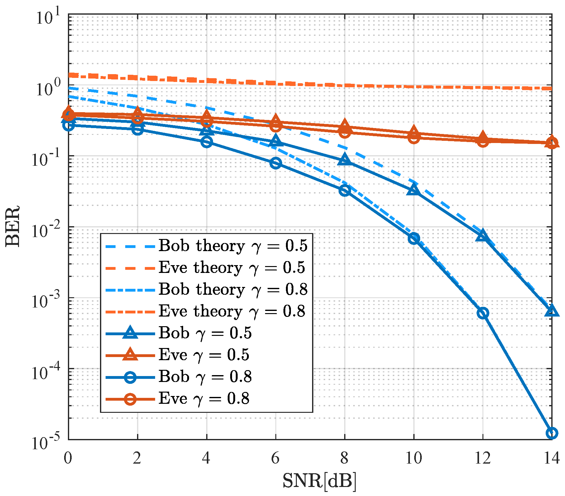 Figure 6, as the SNR increases, the BER for both schemes decreases for Bob, with Eve’s performance remaining poor. However, at a BER of