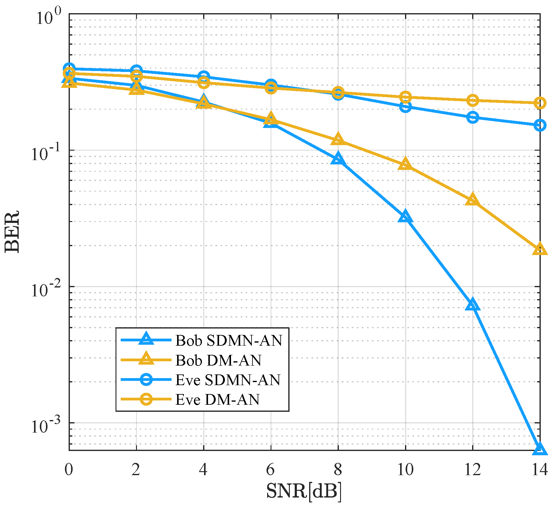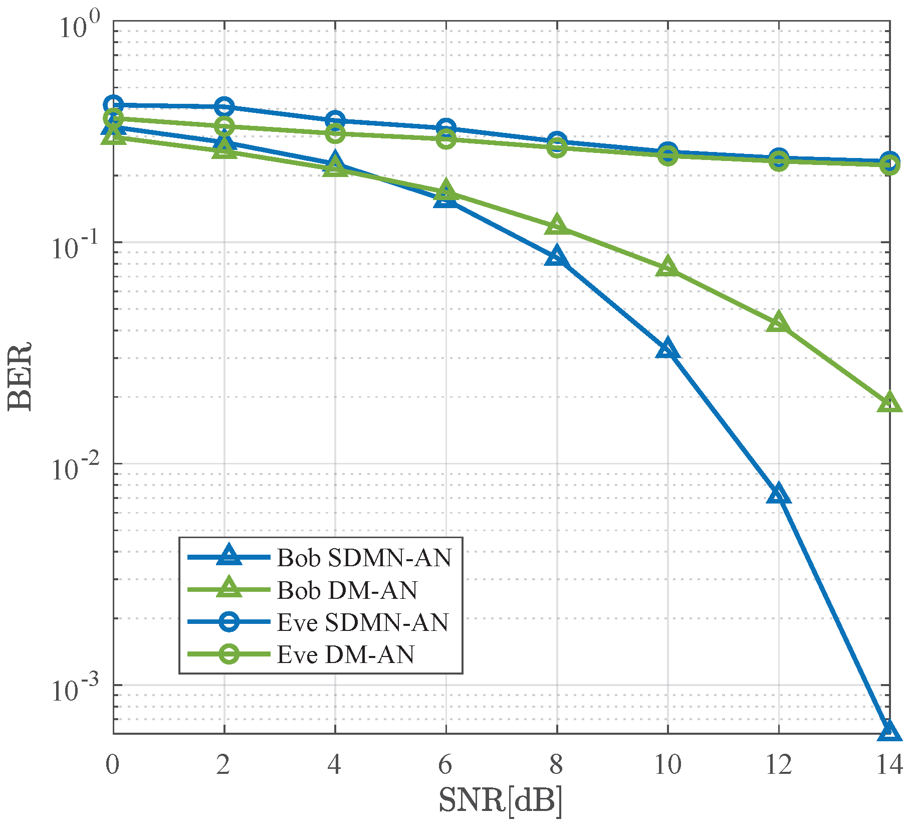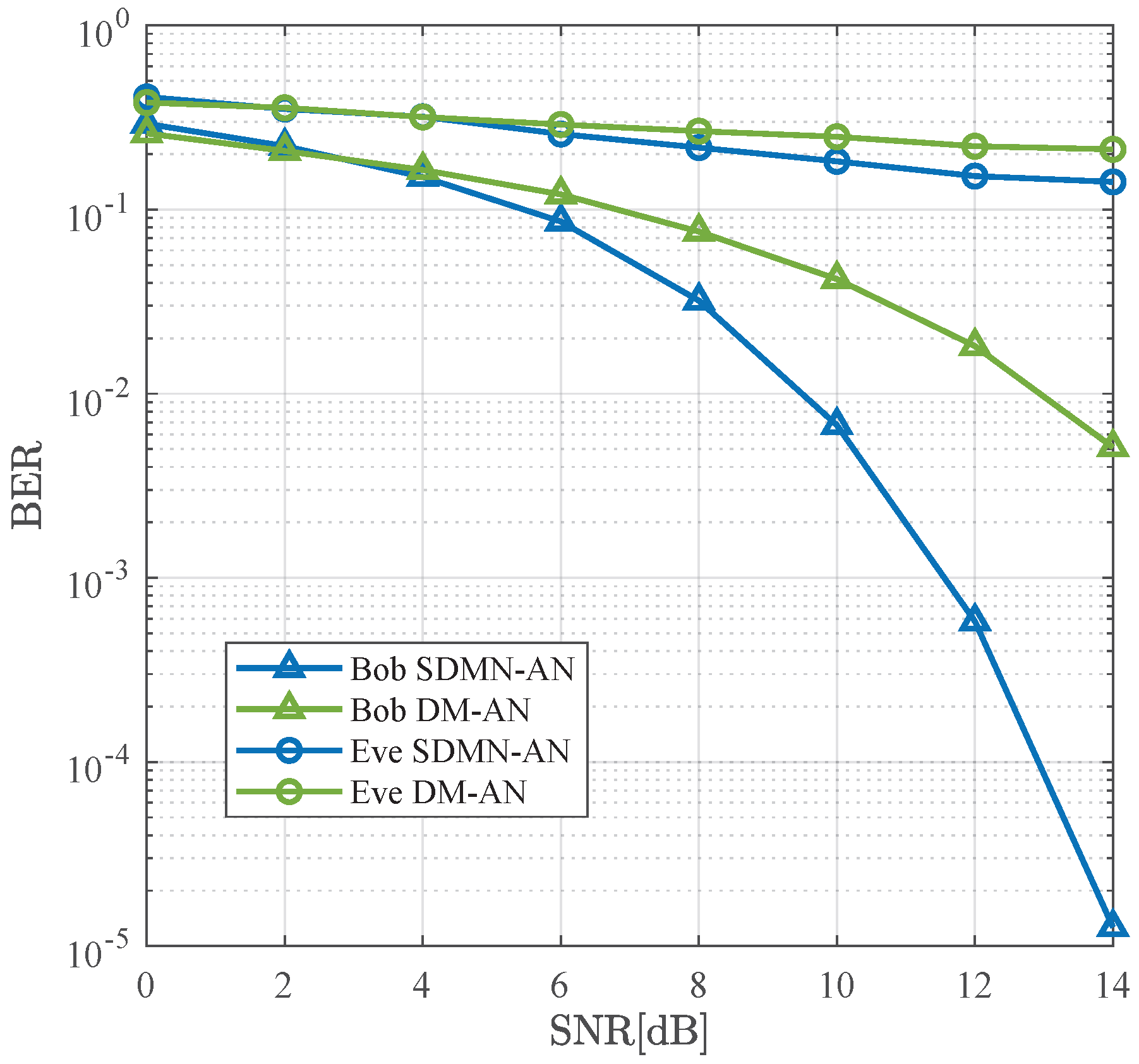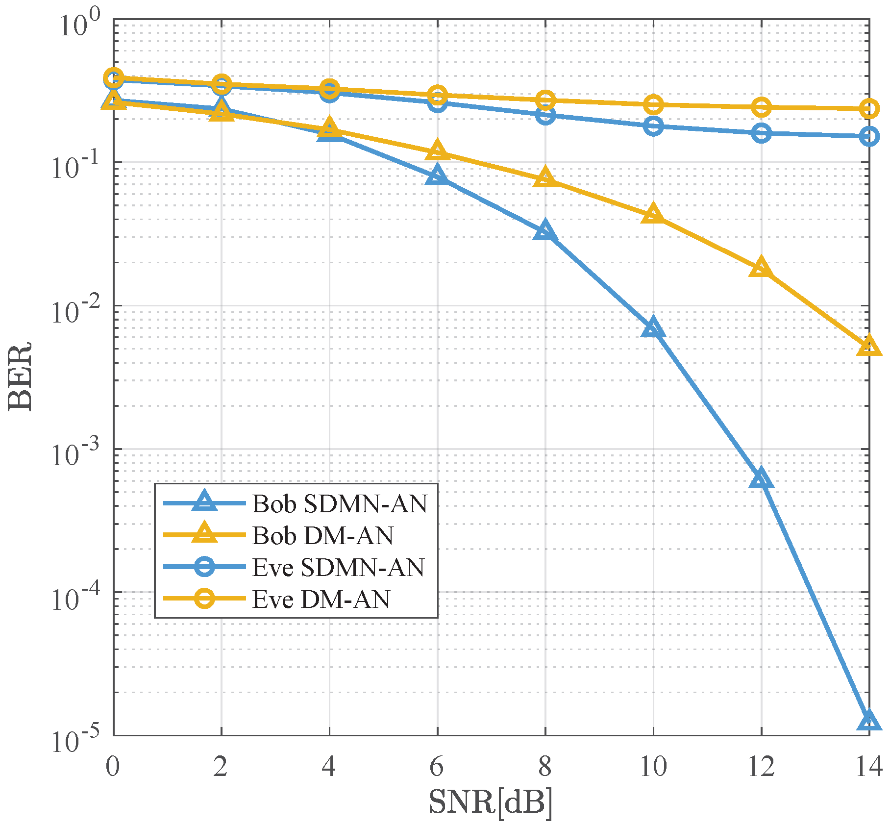 In this section, the security performance of the proposed SDMN-AN scheme is evaluated by comparing its BER with that of the DM-AN scheme presented in [