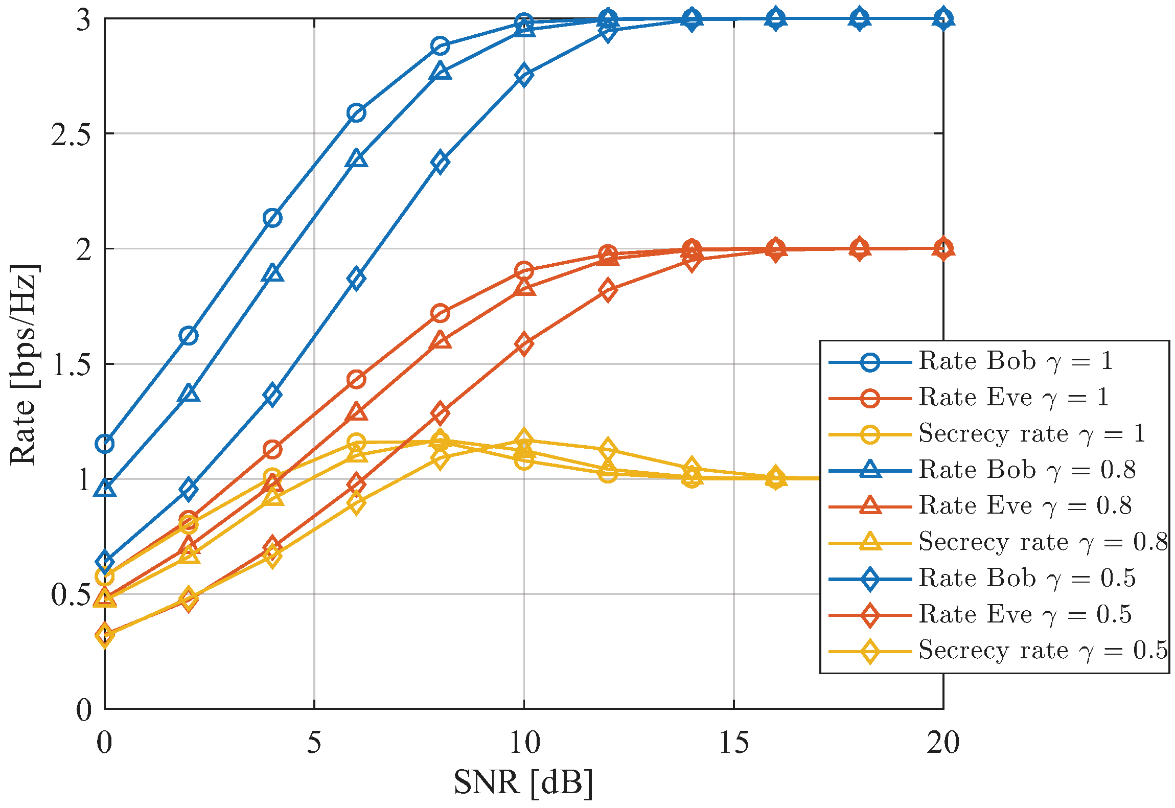 decreases, the SNR at which the secrecy rate attains its peak shifts to a higher value. In practical implementations, the parameter