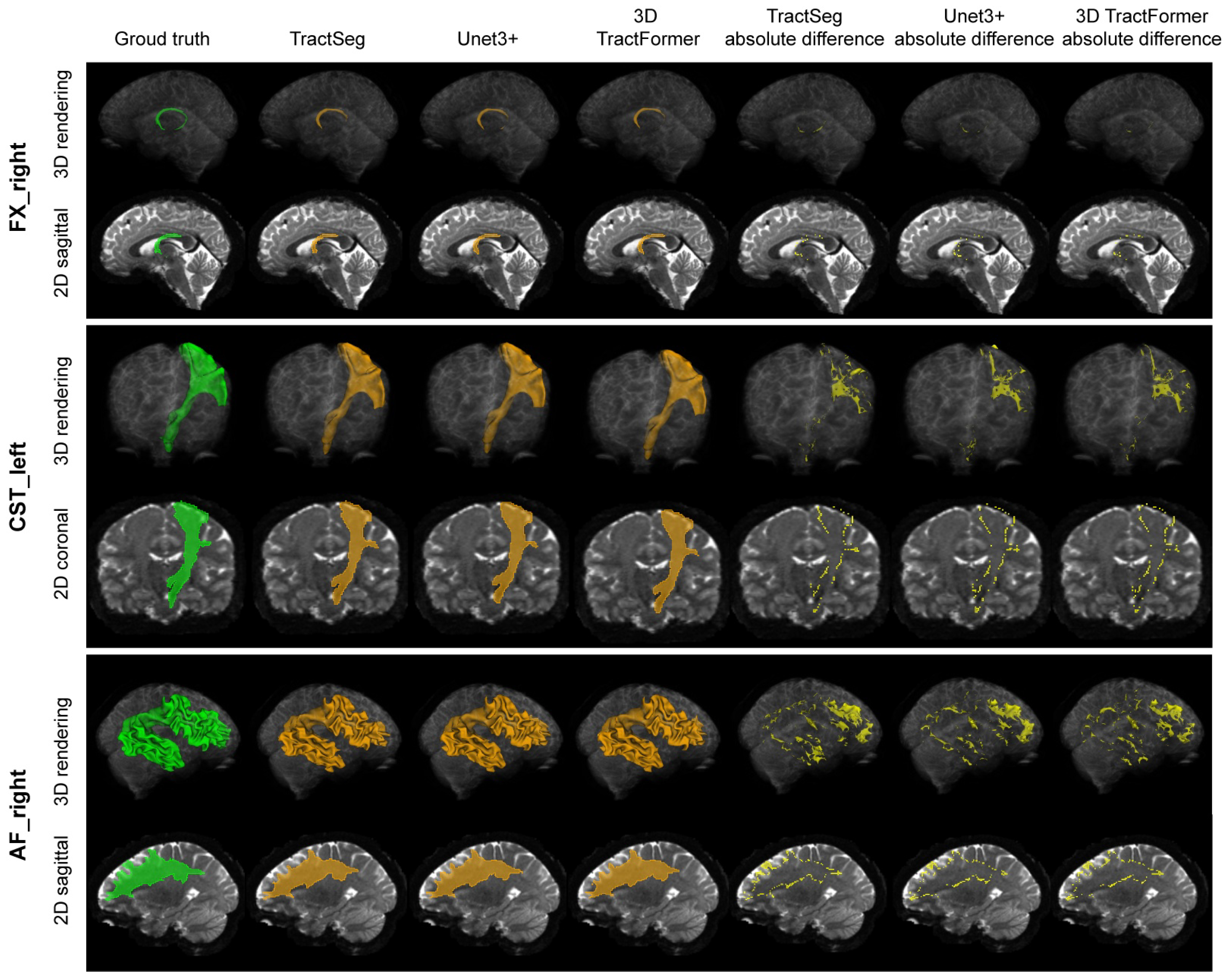 | Unet3+ | AC-UNet | 3D TractFormer | Unet3+ | AC-UNet | 3D TractFormer | |
