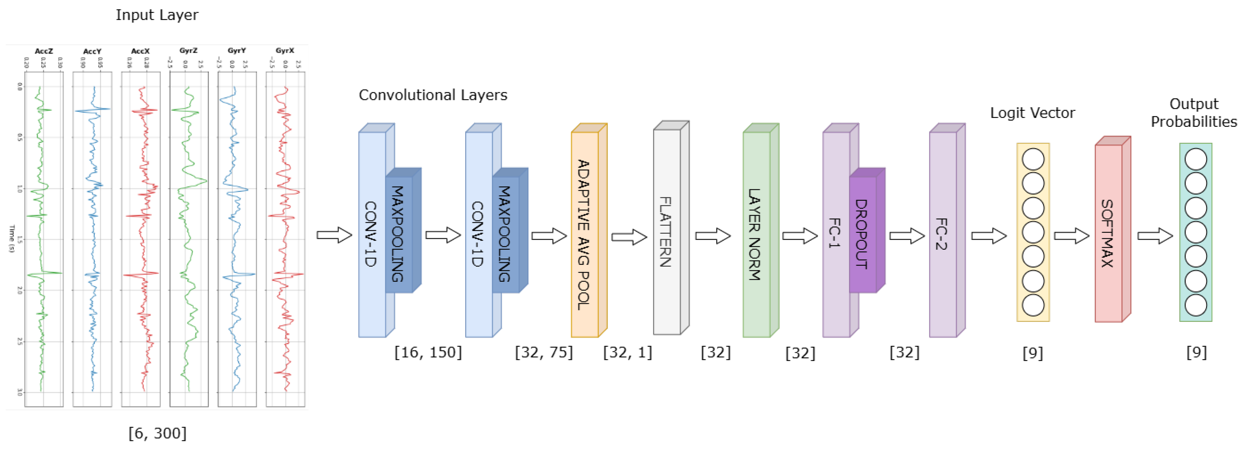 33]. The proposed classification backbone consists of a two-layer one-dimensional CNN, designed to prioritize efficiency and ease of deployment while maintaining sufficient discriminative power. The neural network is composed of two convolutional blocks (Conv1D–ReLU–MaxPool) with increasing channel dimensionality (16 → 32) followed by adaptive average pooling to aggregate temporal features and layer normalization to obtain a compact 32-dimensional representation. This feature vector is then passed through a fully connected layer with ReLU activation and dropout regularization and finally projected into the class space through a linear output layer. The resulting logit vector