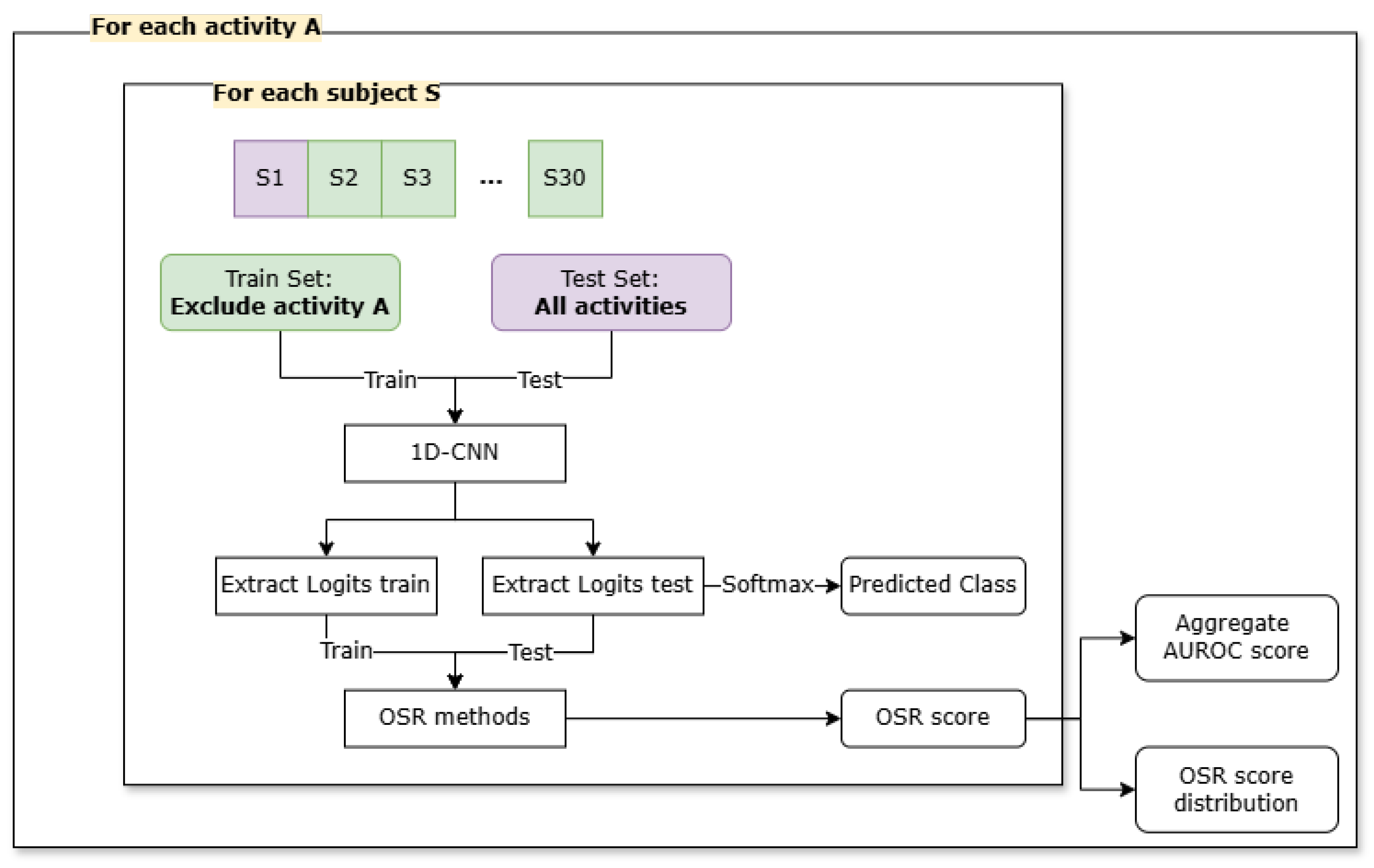 To evaluate OSR performance, a nested validation scheme was designed combining leave-one-activity-out (LOAO) and leave-one-subject-out (LOSO) cross-validation (