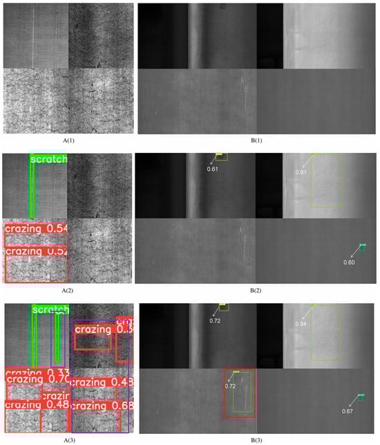 Images on the left column A(1–3) represent Northeastern University Surface Defect Database for Detection (NEU-DET) images while images on the right column B(1–3) represent GongChang Surface Defect Database for Detection (GC10-DET) dataset. Comparison of defect detection performance across deep learning models (1st row: original image, 2nd row: YOLOv9c, and 3rd row: EPSC-YOLO), illustrating localization of surface defects and wear features on the cutting tool edge and flank region, where chipping, abrasion, and surface damage typically initiate [72].