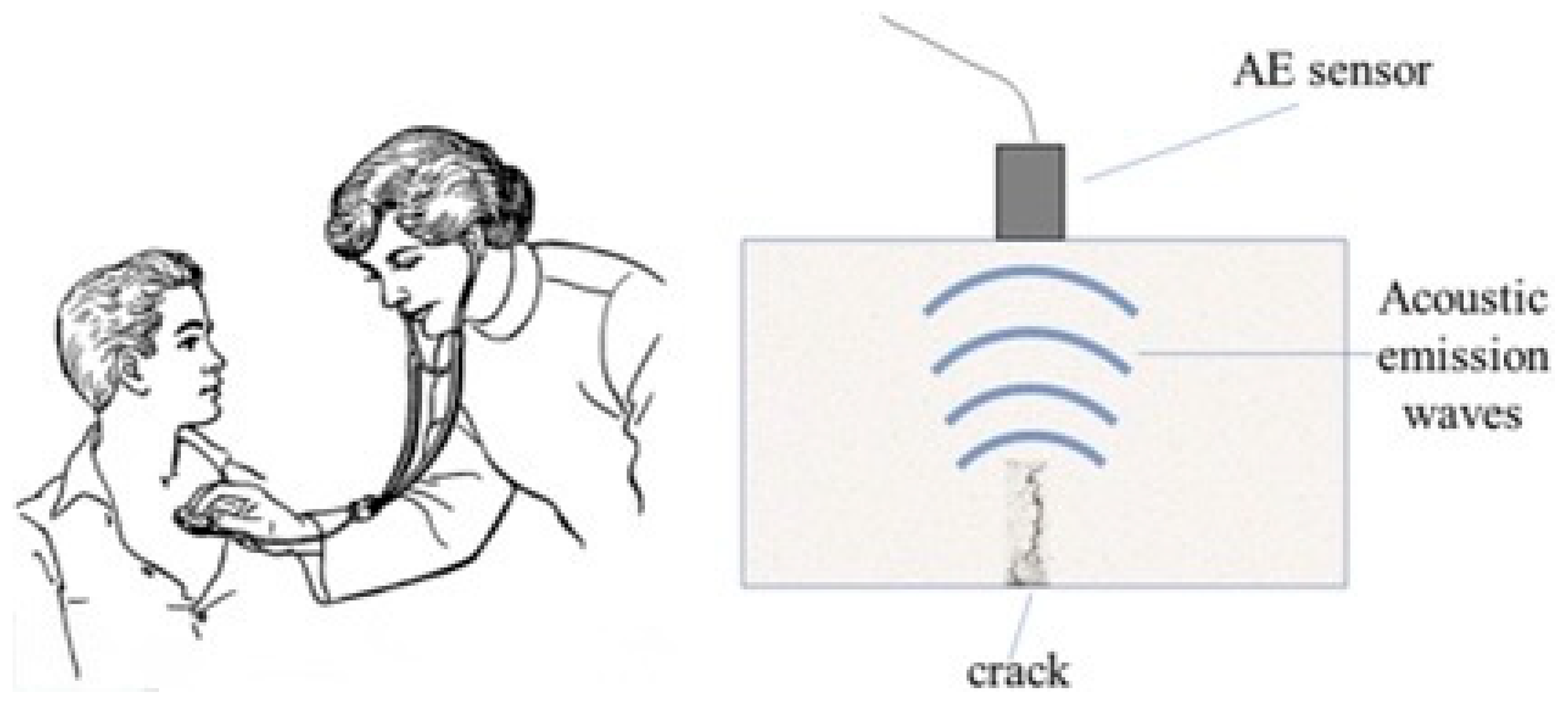 - Pénicaud, M.; Lequien, F.; Fisher, C.; Recoquillay, A. Review of Current Trends and Uses of Machine Learning for Discrete Acoustic Emission Interpretation. J. Nondestr. Eval. 2025, 44, 109. [Google Scholar] [CrossRef]