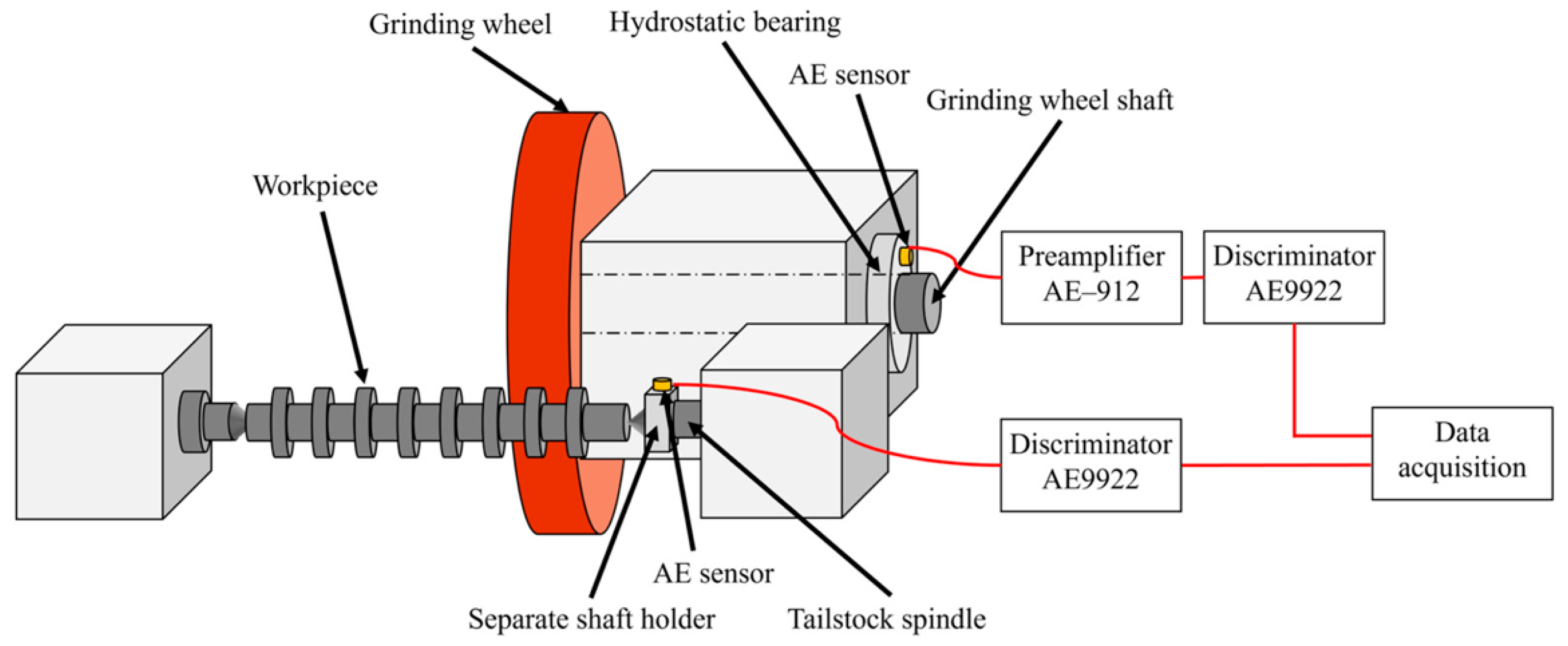 - Kon, T.; Mano, H.; Iwai, H.; Ando, Y.; Korenaga, A.; Ohana, T.; Ashida, K.; Wakazono, Y. Effect of Acoustic Emission Sensor Location on the Detection of Grinding Wheel Deterioration in Cylindrical Grinding. Lubricants 2024, 12, 100. [Google Scholar] [CrossRef]