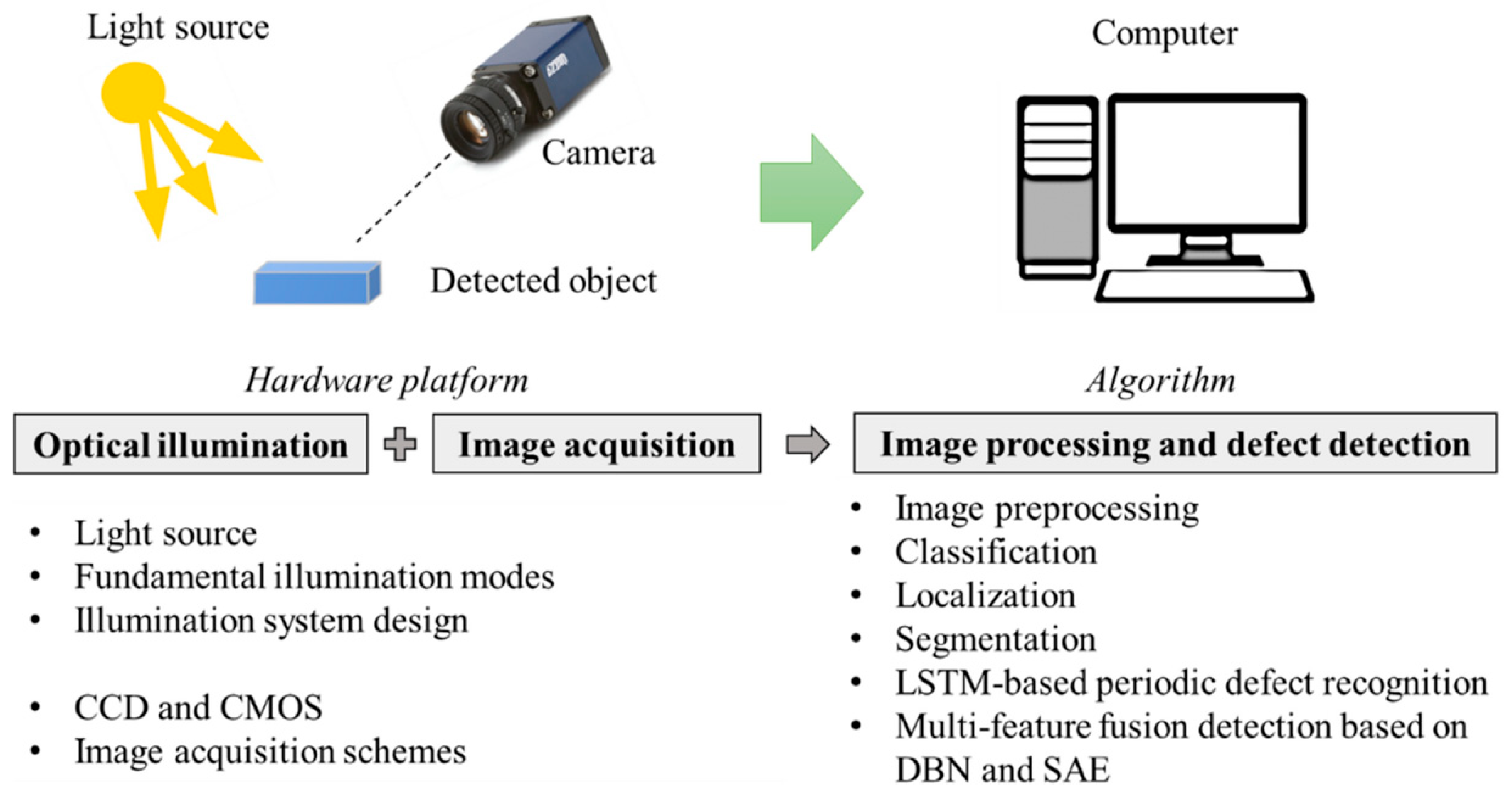 - Ren, Z.; Fang, F.; Yan, N.; Wu, Y. State of the Art in Defect Detection Based on Machine Vision. Int. J. Precis. Eng. Manuf.-Green Technol. 2022, 9, 661–691. [Google Scholar] [CrossRef]