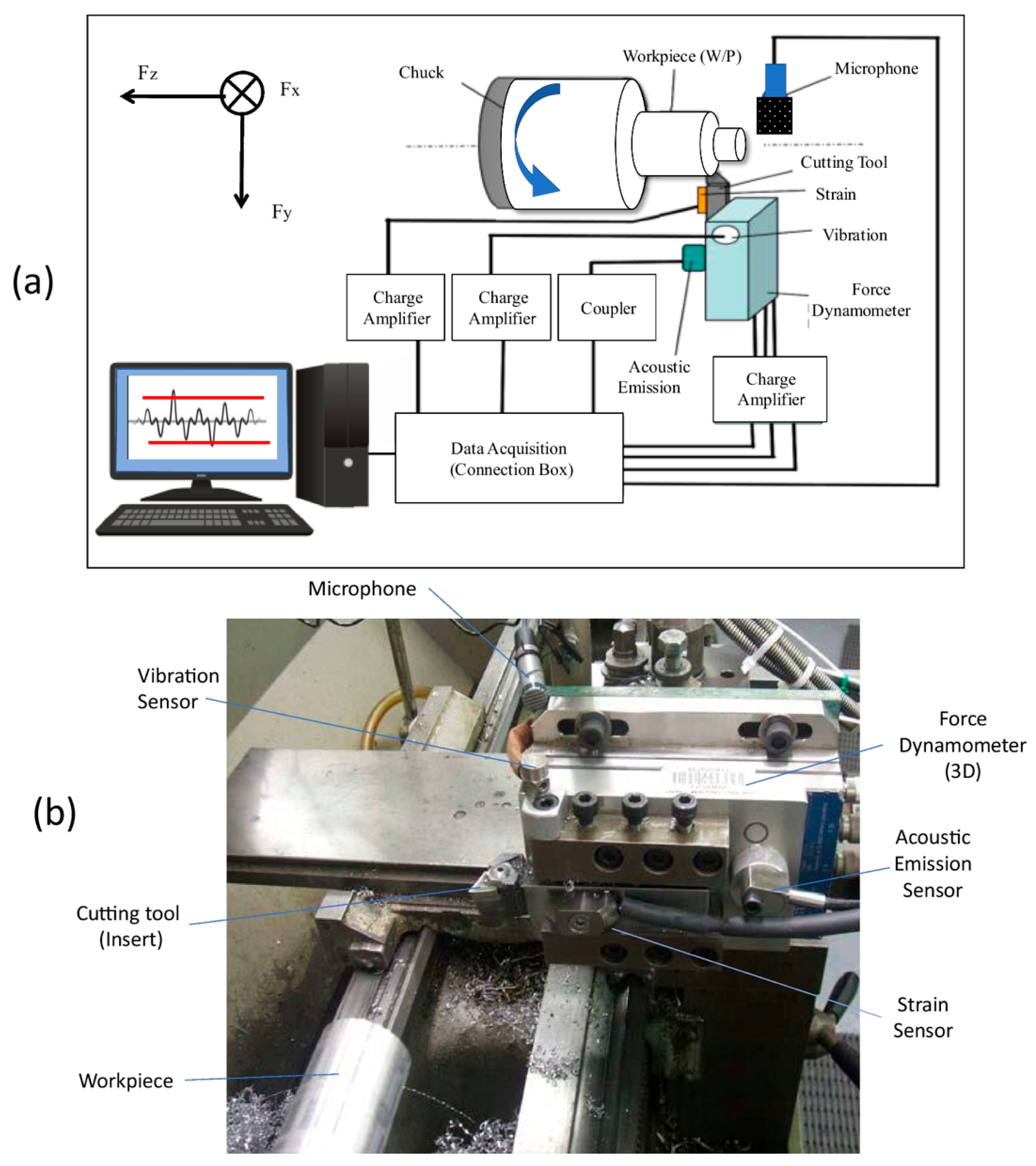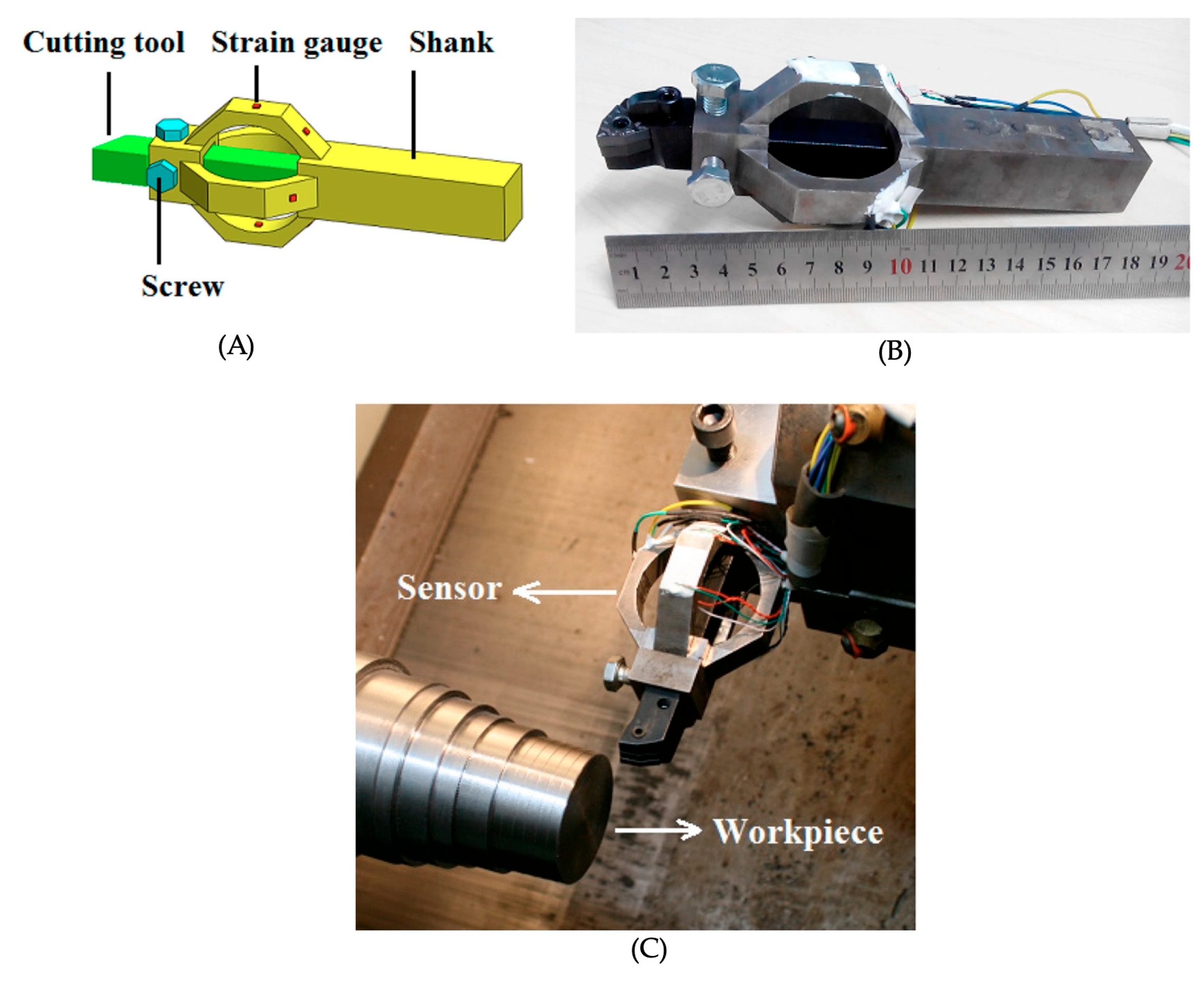 - Mohanraj, T.; Uddin, M.; Thangarasu, S.K. Review on sensor design for cutting force measurement. Proc. Inst. Mech. Eng. Part E J. Process Mech. Eng. 2023, 237, 455–466. [Google Scholar] [CrossRef]