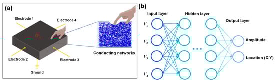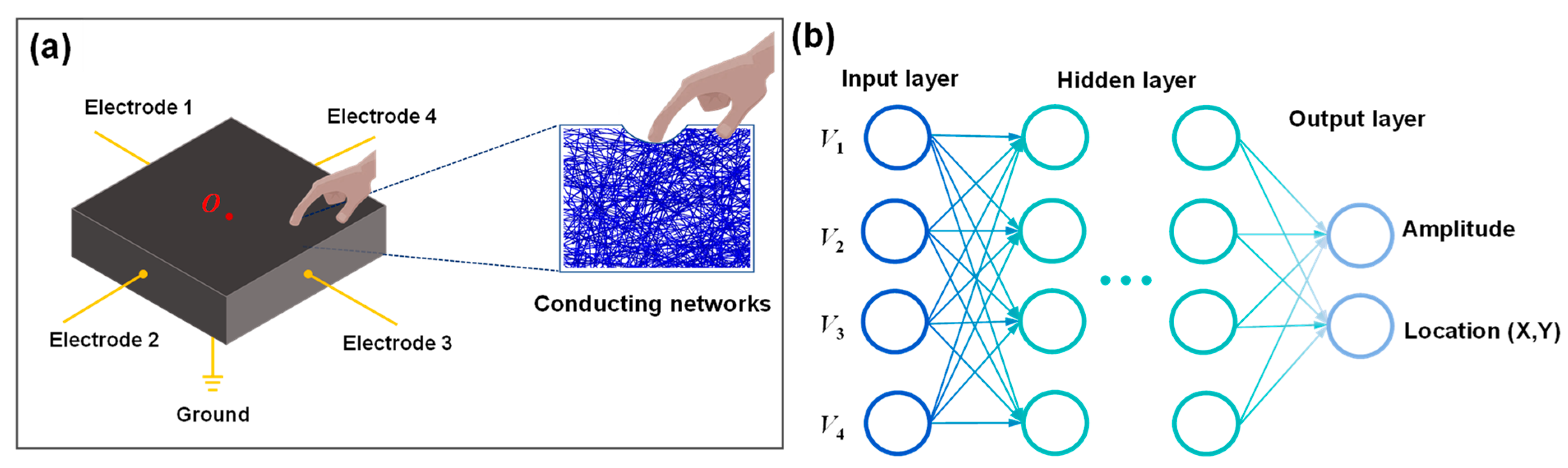 Figure 1. (a) Schematic illustration showing the electrode layout and the measurement of the resistance response characteristics of conductive composite materials. (b) Artificial neural network model used to predict load amplitude and location coordinates.