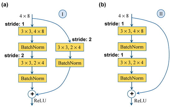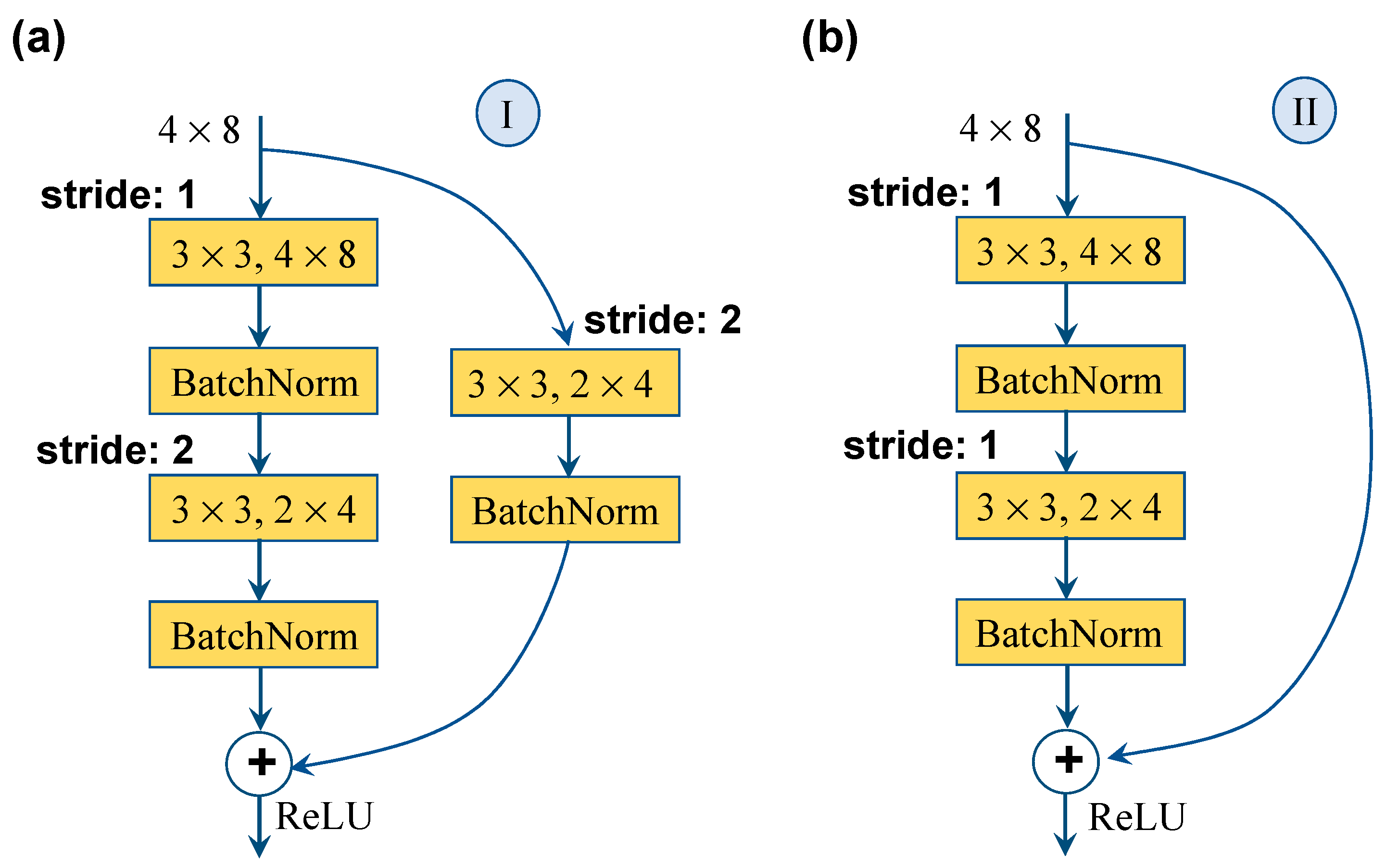 A multilayer feature analysis strategy consists of two residual blocks which are utilized to avoid the image information loss and gradient explosion. Each residual block includes two convolutional layers and one downsampling convolutional layer. To ensure consistency in the output dimension after the residual block, a judgment is performed before inputting the residual block. If the input channel differs from the output channel or the stride is not set to 1, residual block I is used, as shown in Figure 4a. Otherwise, residual block II is used, as shown in Figure 4b.