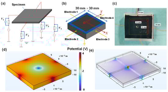 Figure 5. Diagram showing (a) the electrode configuration and (b) the geometric dimensions. (c) Optical image of the CNT/silicone resin composite. (d) Simulation results of the electrical potential mapping when applying a voltage of 4 V at four boundary electrodes and (e) the corresponding electrical field distribution.