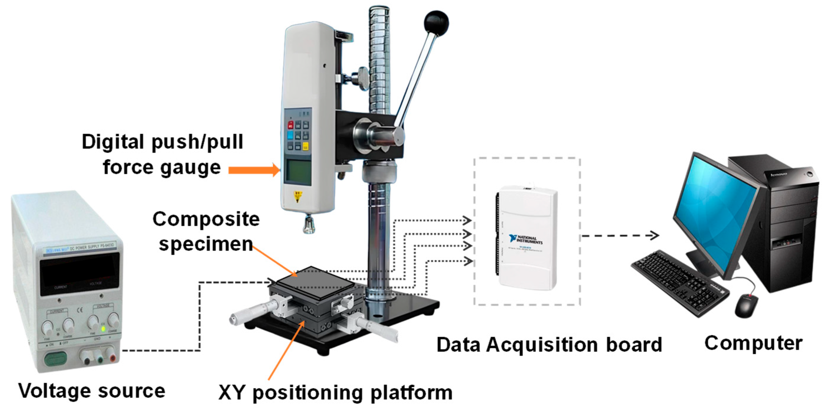 The measurement setup (Figure 2) mainly consists of a digital push/pull force gauge (HPA, Dongguan Fuma Electronic Equipment Co., Dongguan, China), a data acquisition system, and an XY positioning platform (LY80-C, Shenzhen Misi Precision Machinery Co., Shenzhen, China). The composite plate (specimen) was mounted on the XY stage (positioning accuracy: 0.01 mm), allowing for precise positioning at different loading locations. Quasi-static external mechanical loads, ranging from 0 to 3 N, were applied at various positions on the specimen by manually controlling the digital force gauge and adjusting the XY stage. The loading head used in the experiment was a resin cylinder with a diameter of 0.5 mm and a height of 2 cm. The corresponding resistance changes in the four electrode channels were measured and recorded using a four-channel single-arm bridge and a signal acquisition card (USB-6211, National Instruments, Austin, TX, USA). The raw signals were digitized at a sampling frequency of 1000 Hz and subsequently filtered using a third-order inverse Chebyshev filter with a cutoff frequency of 5 Hz to suppress high-frequency noise while preserving the essential load-response characteristics. LabVIEW software (2020 version) was employed for visualizing the voltage and resistance changes and for data storage.