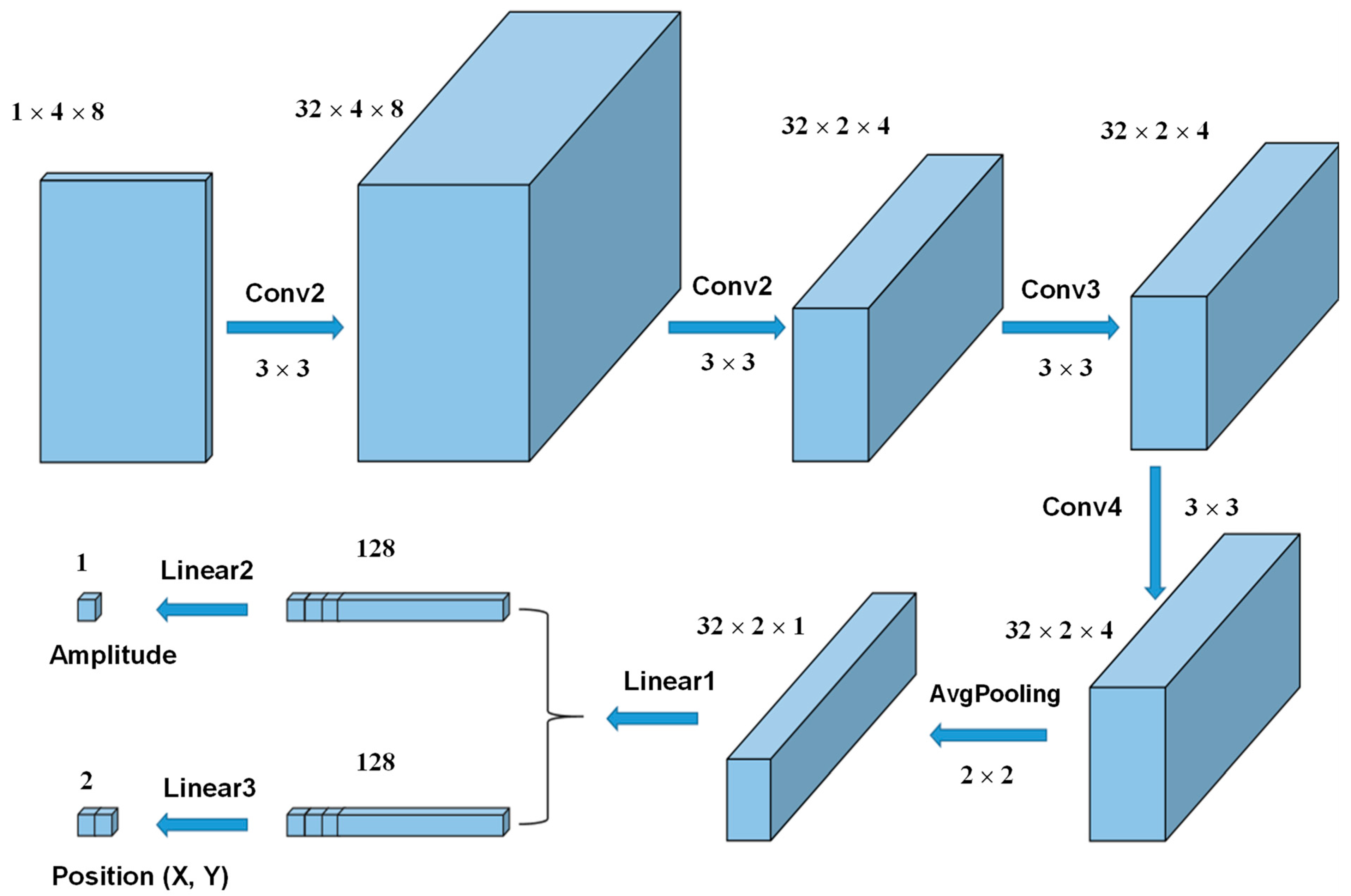 CNN, as a type of artificial neural network, has strong self-learning and feature extraction capabilities [34]. This study proposed a CNN model that integrates four convolutional layers, one average pooling layer, and four fully connected layers, as shown in Figure 3. Additionally, residual learning blocks were incorporated into the CNN architecture to enhance performance. The convolution layer and pooling layer are the core components for feature extraction. The batch size of each electrode channel was set to 8, and the data of four electrode channels were spliced into a 2D image (4 × 8 matrix). The 2D image datasets were then processed using a convolution kernel (3 × 3 Sobel filter), with activation via the ReLU function at the convolution layer. The convolution kernel moves across the input matrix with a specific stride size, and the multiplied values between the input and kernel are summed to form the output. Batch normalization was applied after each convolution operation to accelerate the network training and convergence. To reduce the data size and prevent overfitting, an average pooling layer was used for downsampling. The pooling filter (2 × 2) selects the average value from each patch of the feature map, thereby reducing the spatial size of the input images. Finally, the extracted features from the 2D images were presented as planar vectors. These vectors were then fed into the fully connected layers, and their dimension was ultimately transformed at the regression layer to predict the amplitude and center coordinates (X, Y) of the loads. The output of the CNN model consists of a load amplitude matrix (8 × 1) and a loading position matrix (8 × 2). A loss function based on mean absolute error (MAE) was used to evaluate the error between predicted amplitude and true amplitude, and root mean square error (RMSE) was used to evaluate the localization error between predicted position and true position.