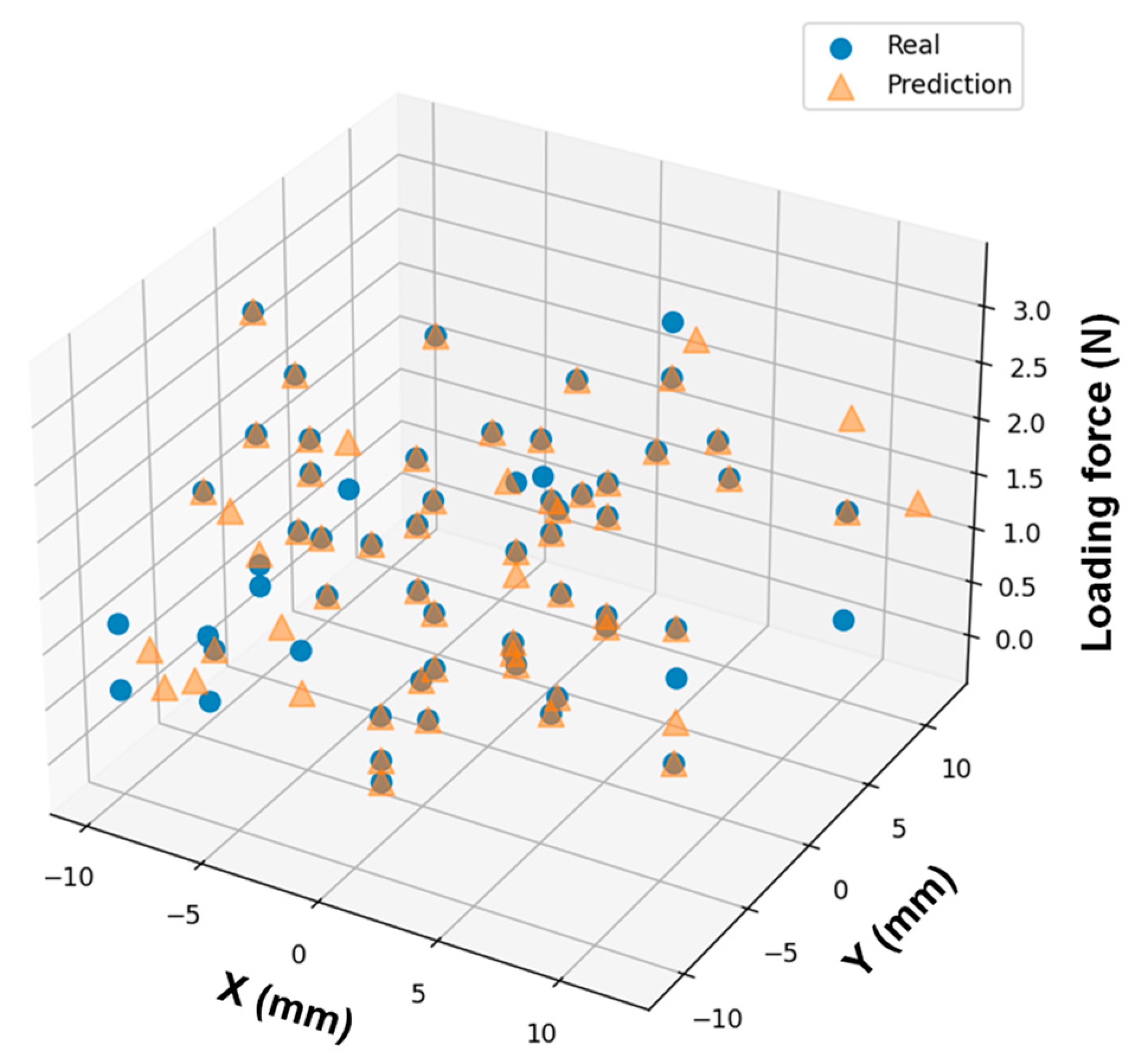 Figure 7. Three-dimensional scatter plot showing the prediction results and the real mechanical loading.