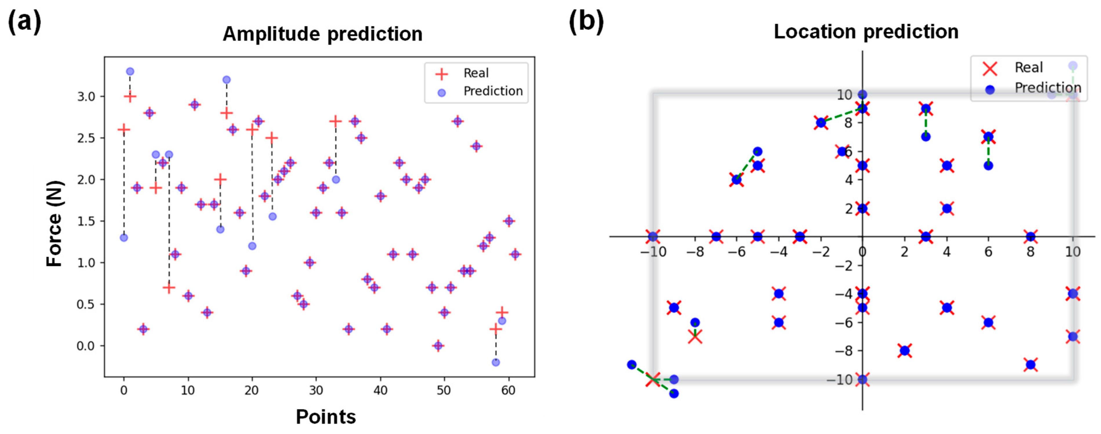 Figure 6 shows the representative loss curves of training. It can be noted that loss of validation value converged after 10 epochs. After the first 10 epochs, the training loss curves decrease more and more slowly, suggesting convergence to a local optimal solution and developing towards lower error values. This result indicates the effectiveness of the CNN model in performing the load prediction task. A set of untrained data was input into the established CNN model to evaluate its generalization ability. All load predictions were conducted within a few seconds. Figure 7 shows the three-dimensional (3D) scatter plot of the predicted position and amplitude of the applied mechanical loads in the test set. The X-axis and Y-axis represent the position coordinates, and Z-axis is the load amplitude. It can be noted that the prediction result is consistent with experimental result for each load. To more intuitively show the predication results, two-dimensional (2D) scatter plots were used to display the real load position and their identification results. Figure 8a exhibits the prediction results for load amplitudes. The red plus sign (+) represents the real amplitude of the external loads, and the light purple round dot () represents the predicted amplitude. If the real value is different from the predicted value, a dotted line was used to indicate the corresponding prediction error between the two values. The calculated MAE is 0.13 N. Figure 8b shows the predicted load position coordinate (X, Y) by the proposed CNN model. The red times sign (×) represents the real load position, and the blue round dot () represents the predicted position. The RSME was used to evaluate the position prediction result, with the calculated RMSE being 0.91 mm. These results fully demonstrate that the proposed CNN model can learn the features of the dataset well, and exhibits an effective prediction capability with an amplitude prediction error of 0.13 N and a localization prediction error of 0.91 mm. The prediction errors in this study mainly come from the following aspects: First, electrode movement during the loading process caused fluctuations in the collected data. Second, there was some measurement error in the load position. Lastly, the sampling size of the data also has a certain effect on the prediction accuracy.