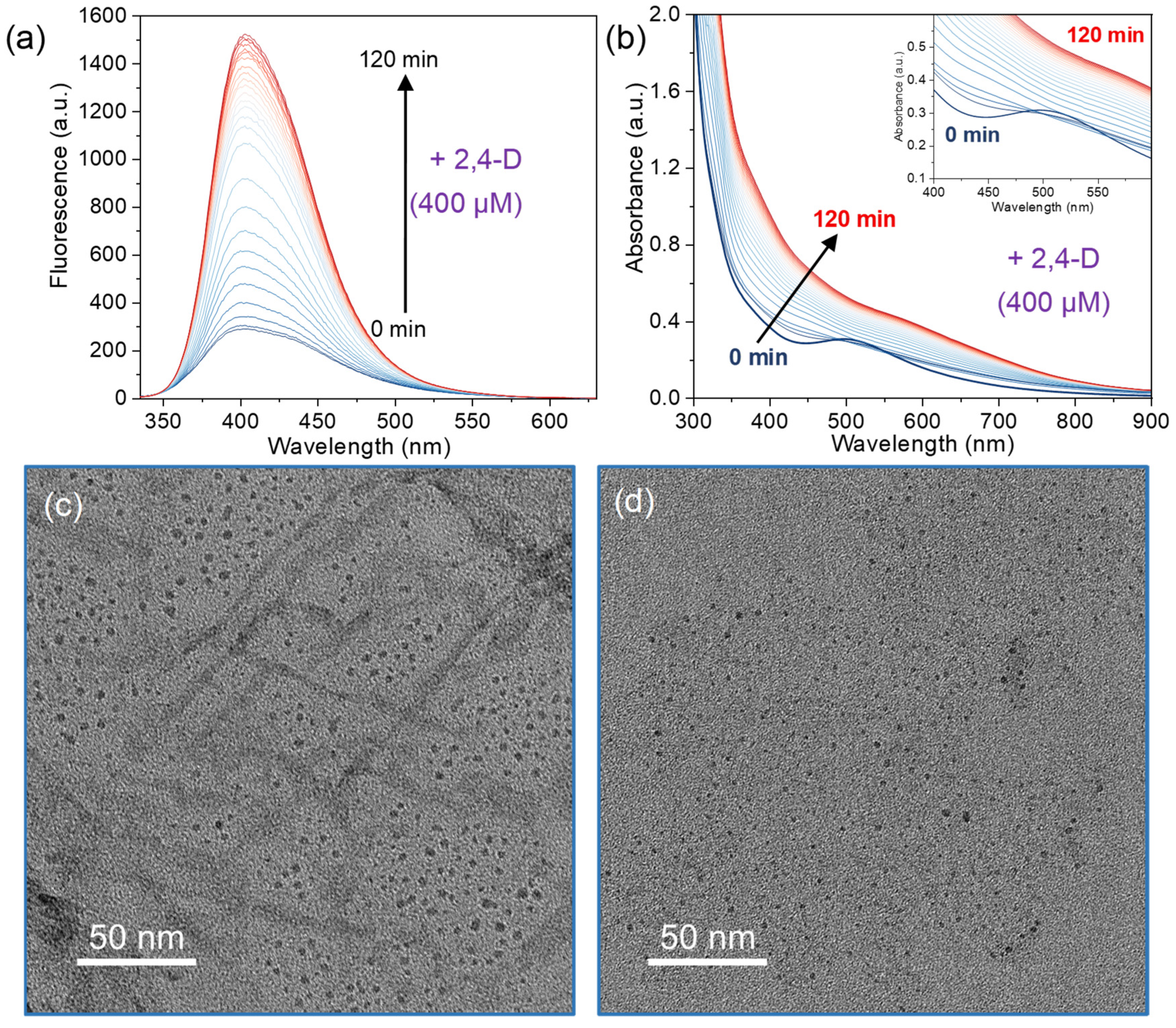 Chicago/Turabian StyleQin, Neng, Qian Wang, Jingwen Tao, Guijian Guan, and Ming-Yong Han. 2026. "Silk Fibroin-Templated Copper Nanoclusters: Responsive Fluorescent Probes Exhibiting 2,4-Dichlorophenoxyacetic Acid-Enhanced Emission and p-Nitrophenol-Induced Quenching" Sensors 26, no. 3: 784. https://doi.org/10.3390/s26030784