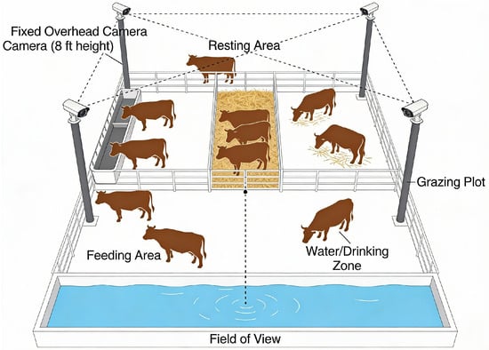 The initial phase of the study was devoted to creating a representative and detailed dataset of cattle images. The Nestlé cattle farm was used to gather data, with high-resolution cameras fixed on pillars, to track the dynamics of activities involving over 300 cows. The final dataset comprises 2956 images, including 2300 images acquired from the Nestlé dairy farm and 656 images obtained from online sources to broaden the variation in breeds and background scenes, while retaining the same four behavioral categories (standing, lying, grazing, and estrus). Farm images were recorded using fixed overhead cameras mounted at approximately 8 ft across multiple locations (feeding, resting, drinking, and open walking areas) and under varying times of day/night and weather conditions. This tactical use was necessary in order to capture natural behavioral patterns and interactions in the herd. A general architectural installation of the image data collection process in terms of its spatial arrangement and overall architectural setup is depicted in Figure 1.