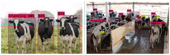 The greatest accuracy of detection was found with regard to the grazing type, with a likelihood of 93%. This is an outstanding outcome that highlights the accuracy of the model in determining the grazing behavior, which is the most critical indicator of cattle health and well-being. The overall system efficiency was supported as inference times were the same as with the rest of the classes. To further determine the strength and external validity of the YOLOv8-L model, more testing was conducted on randomly chosen images obtained on the internet, which are not part of the controlled experimental data. The model has yielded high accuracy and reliable performance in all of the assessed scenarios, such as standing, estrus, lying, and grazing (Figure 8 and Figure 9). These findings support the fact that the model can be generalized to different and unstructured environments. The overall stability inference time with high detection rates in all classes also confirms the effectiveness, reliability, and practical abilities of the YOLOv8-L model to be a reliable, efficient, and realistic method of cattle behavior monitoring and object detection tasks.