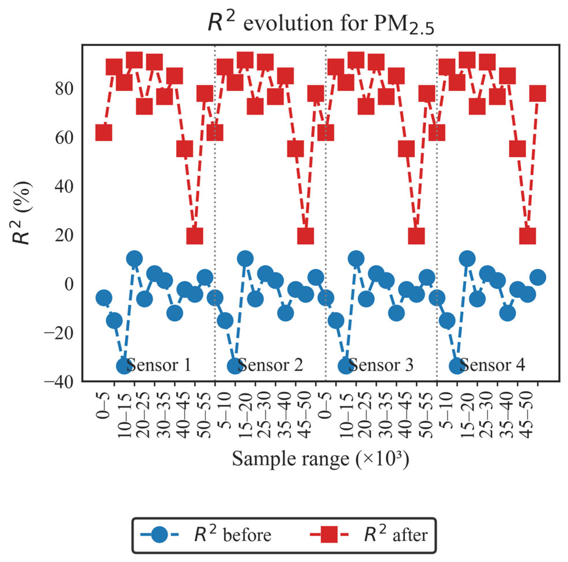 - Hua, J.; Zhang, Y.; de Foy, B. Improved PM2.5 Concentration Estimates from Low-cost Sensors Using Calibration Models Categorized by Relative Humidity. Aerosol Sci. Technol. 2021, 55, 557–570. [Google Scholar] [CrossRef]