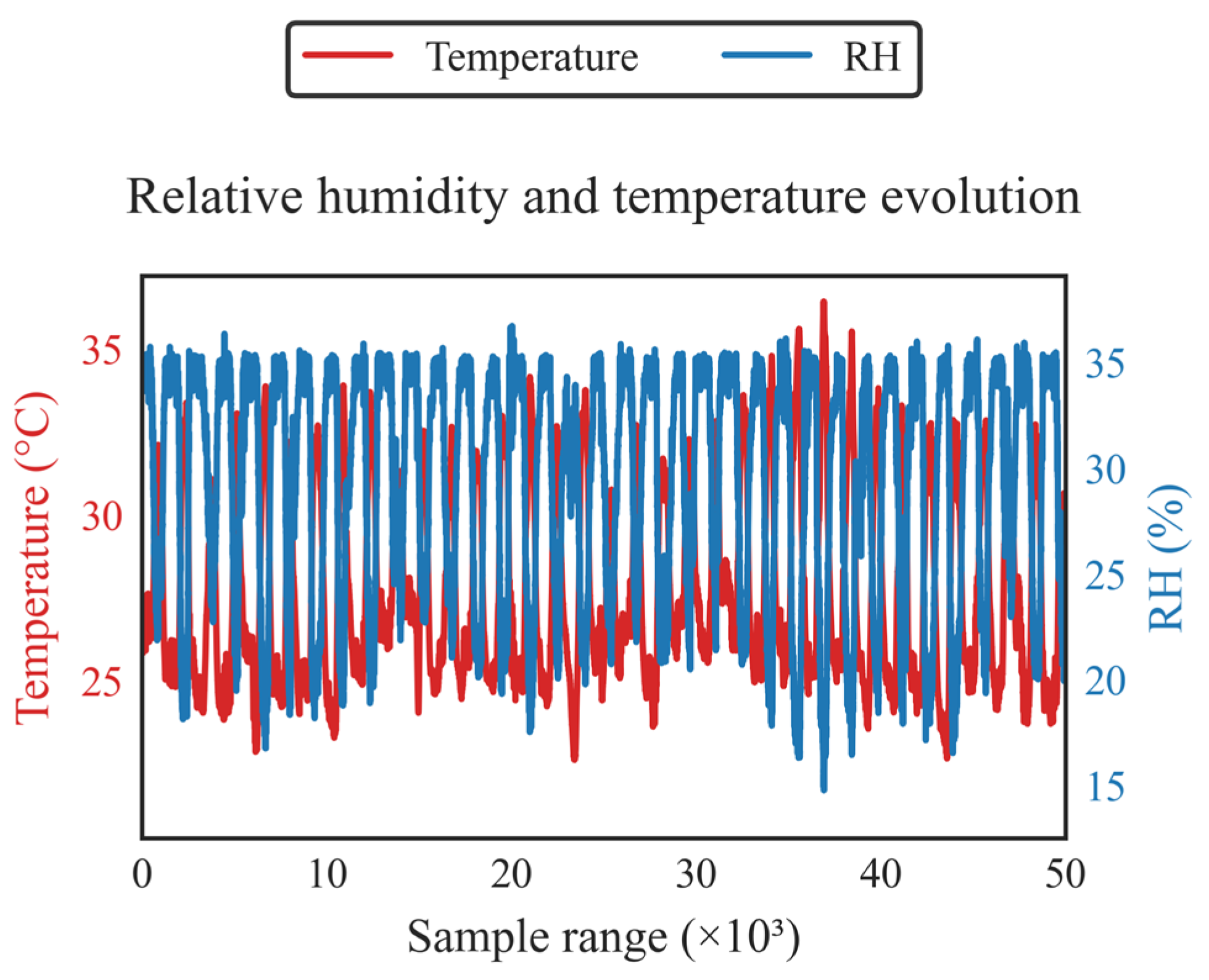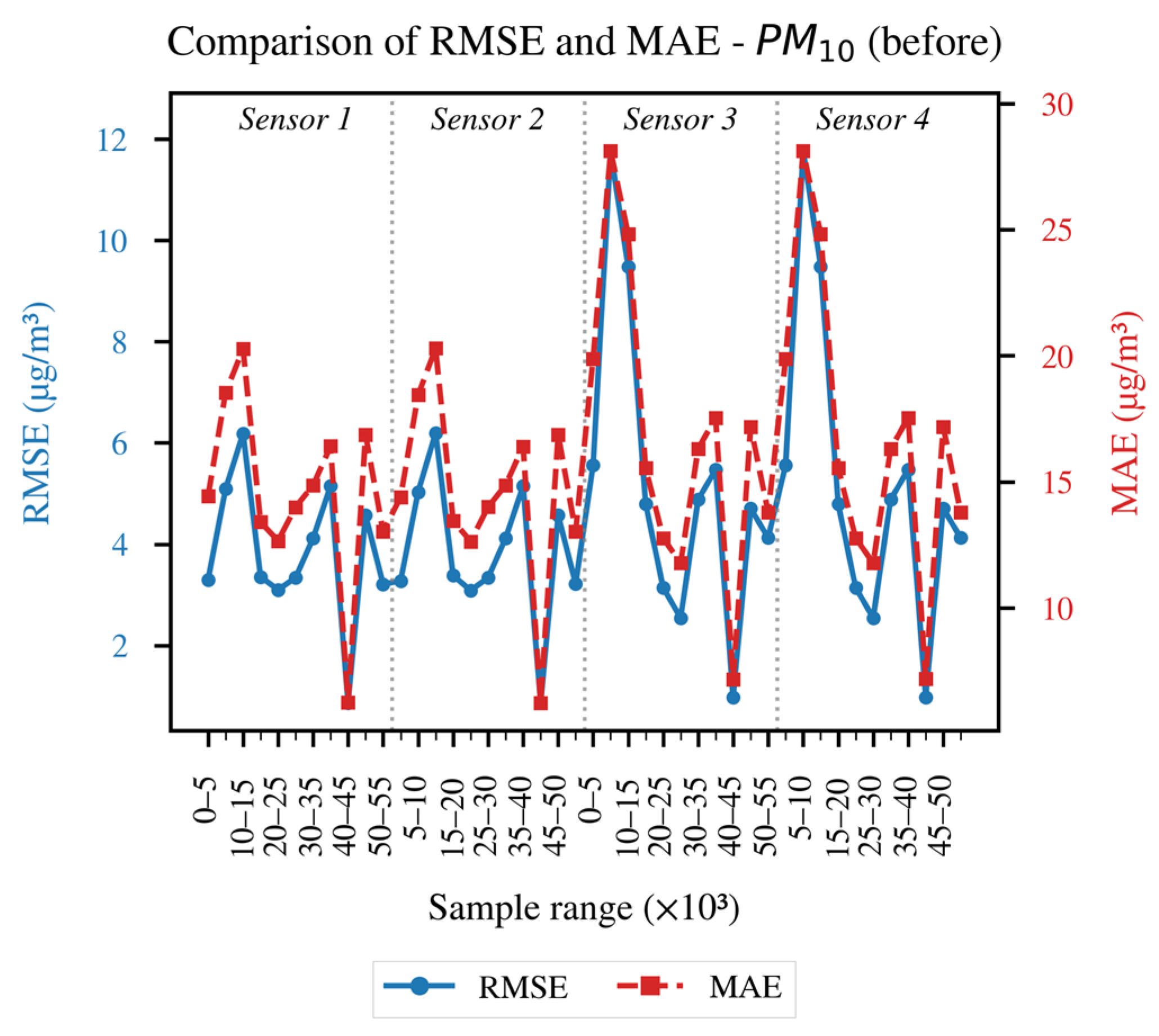 - Data segmentation: The data were divided into blocks of 5000 samples, yielding 11 data sets for each of the four sensors. This approach was adopted to facilitate the analysis of environmental conditions-specifically, the impact of RH on the accuracy of PM readings-a factor identified as critical for the calibration of Low-Cost Sensors (LCS) in the reviewed literature [15].