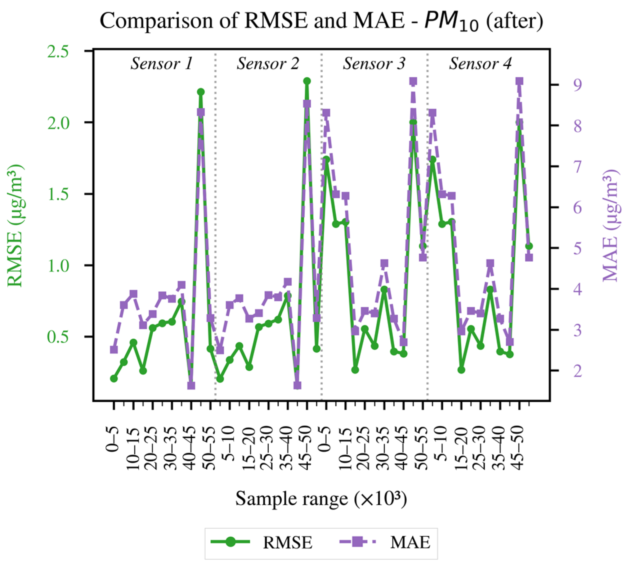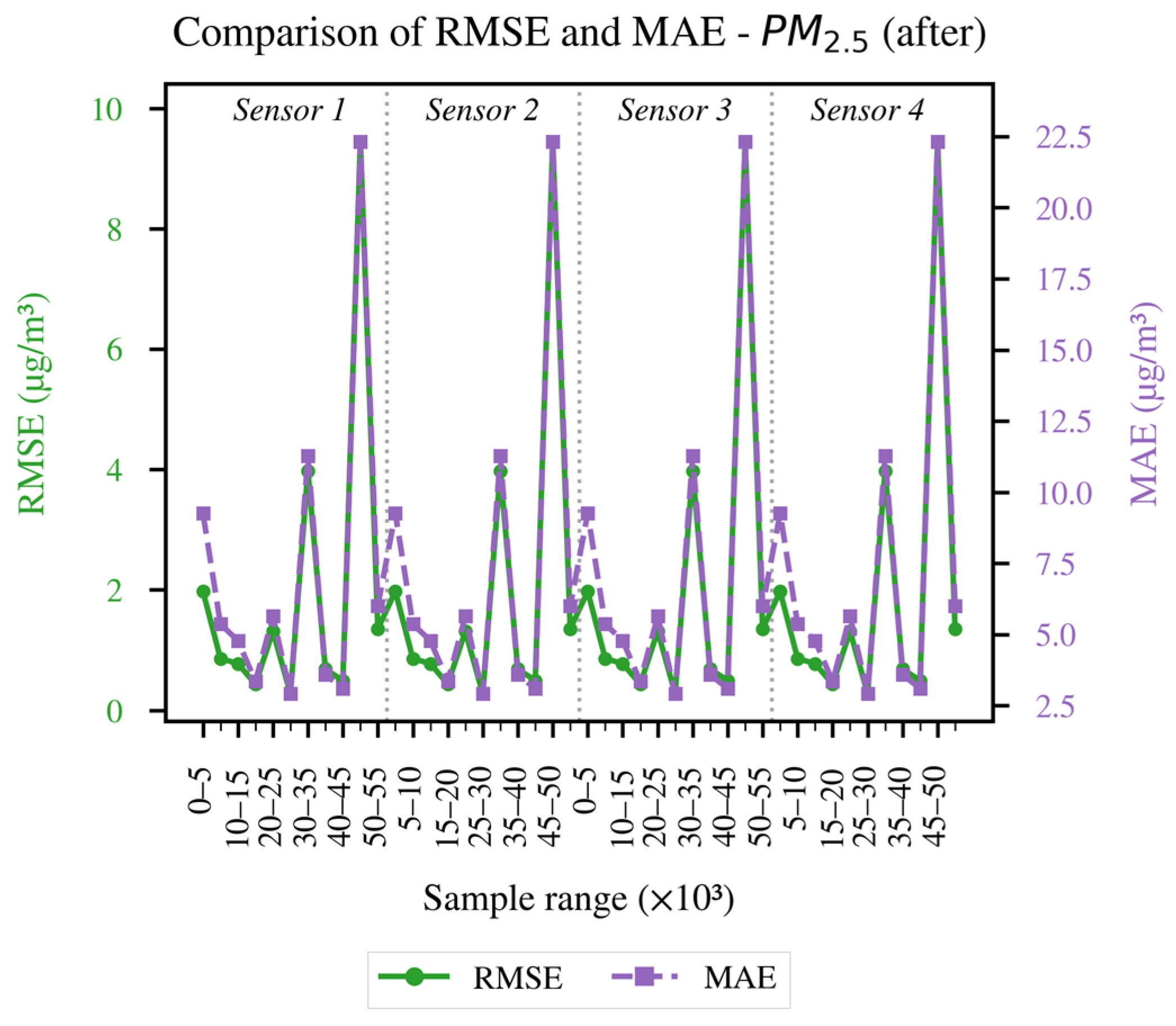- The calculation of Statistical metrics such as R2 (Coefficient of Determination), RMSE (Root Mean Square Error), and MAE (mean absolute error) was performed both before and after preprocessing. This approach helped quantify the level of agreement with the T640X data. The use of these metrics follows recent recommendations for comparing co-located calibrators and is now widely adopted, as highlighted by [19,20].