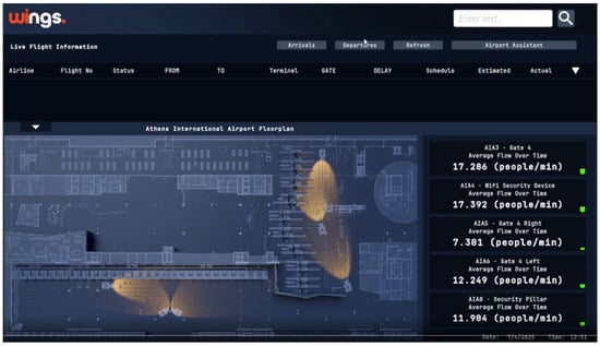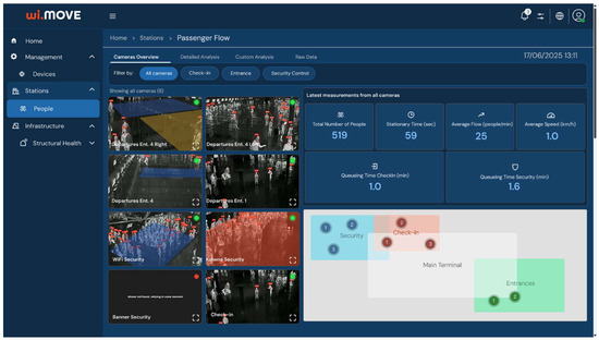 The wi.move platform served as the central intelligence hub, providing real-time visualization through an interactive airport dashboard displaying sensor data overlays, live camera feeds with detection bounding boxes, alert notifications for congestion or anomalies, and comprehensive device management capabilities (Figure 5). The platform computed real-time statistics including total passenger counts, average delay times, flow rates, congestion hotspot identification, queue lengths at selected checkpoints, throughput analysis, and directional movement patterns.